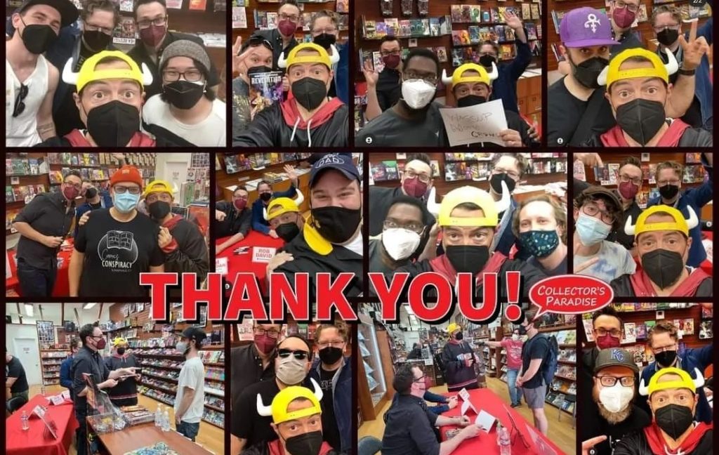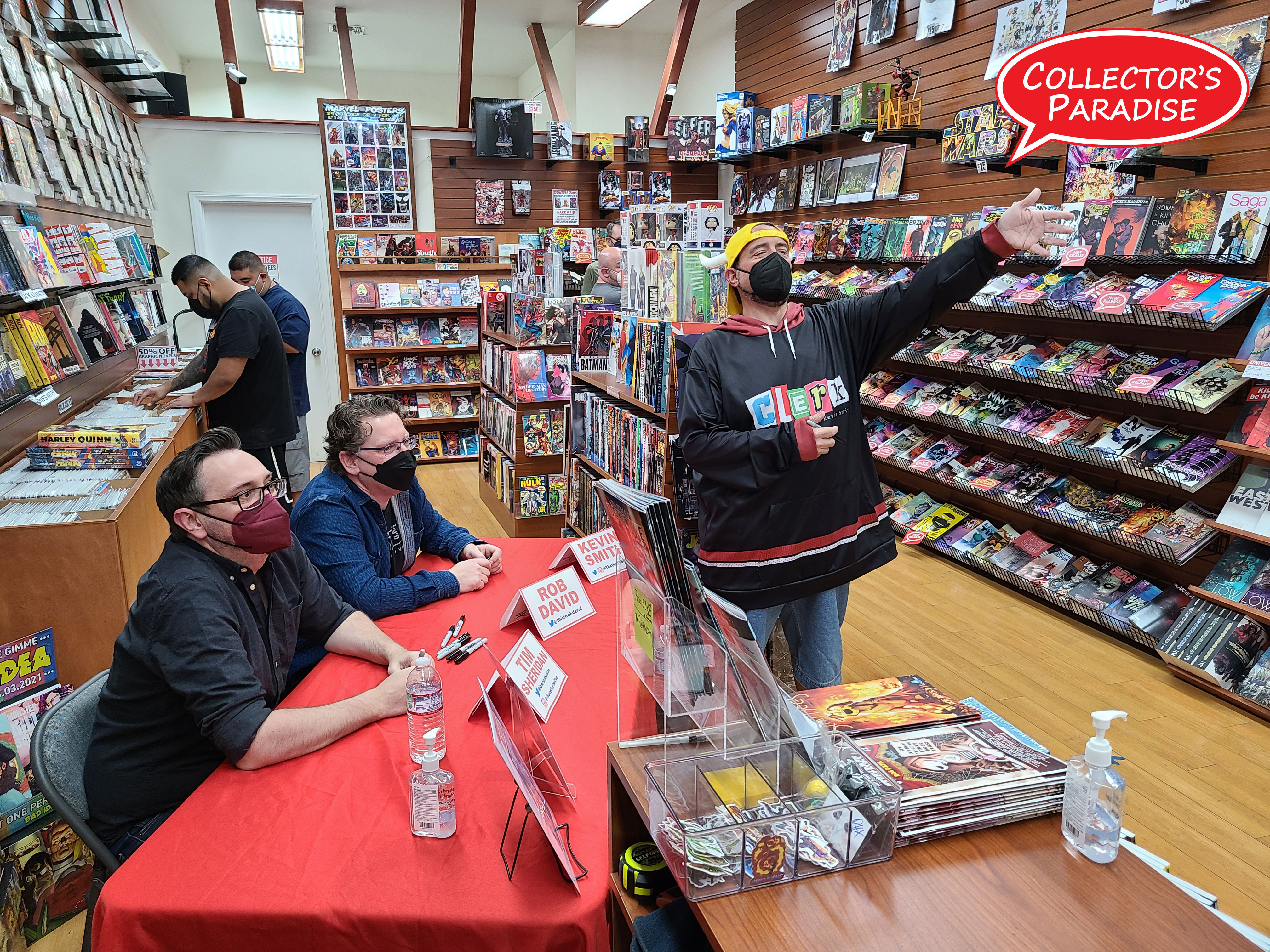 Celebrating the trade paperback collecting all four issues of the “Masters of the Universe: Revelation” prequel series released by Dark Horse Comics officially going on sale this month, Collector’s Paradise in North Hollywood California hosted its writers Kevin Smith & Rob David (story by) and Tim Sheridan (scripts) and offered the trade paperback signed by all three!