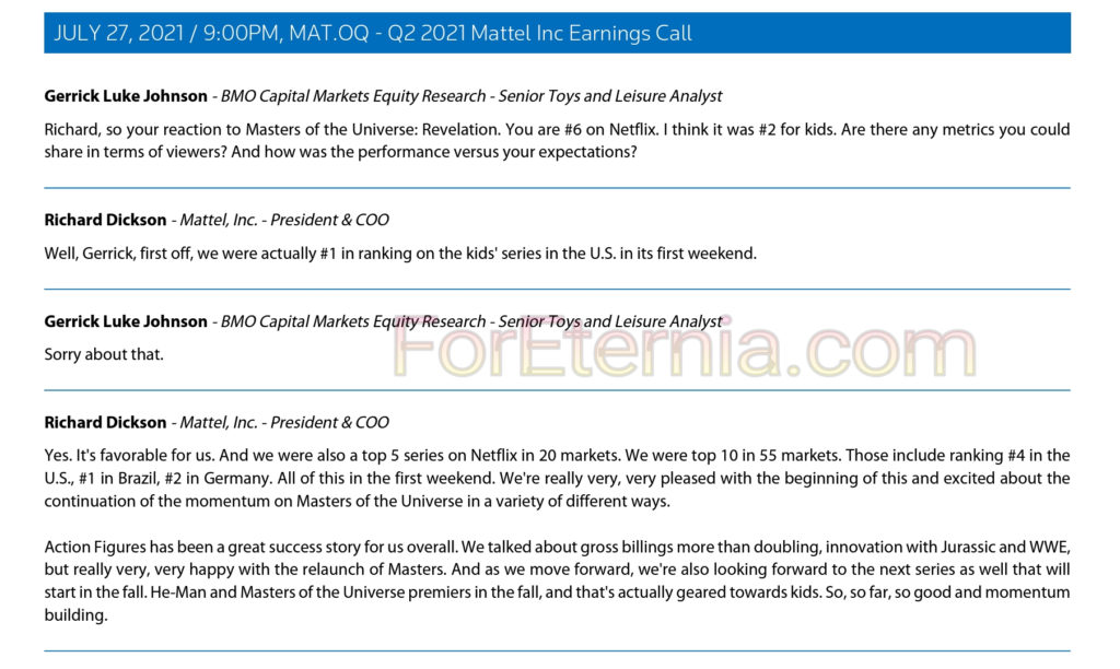 On July 27, 2021, during an earnings call, Mattel’s President and Chief Operating Officer Richard Dickson was asked how “Masters of the Universe: Revelation” was performing on Netflix. Here is the transcript: