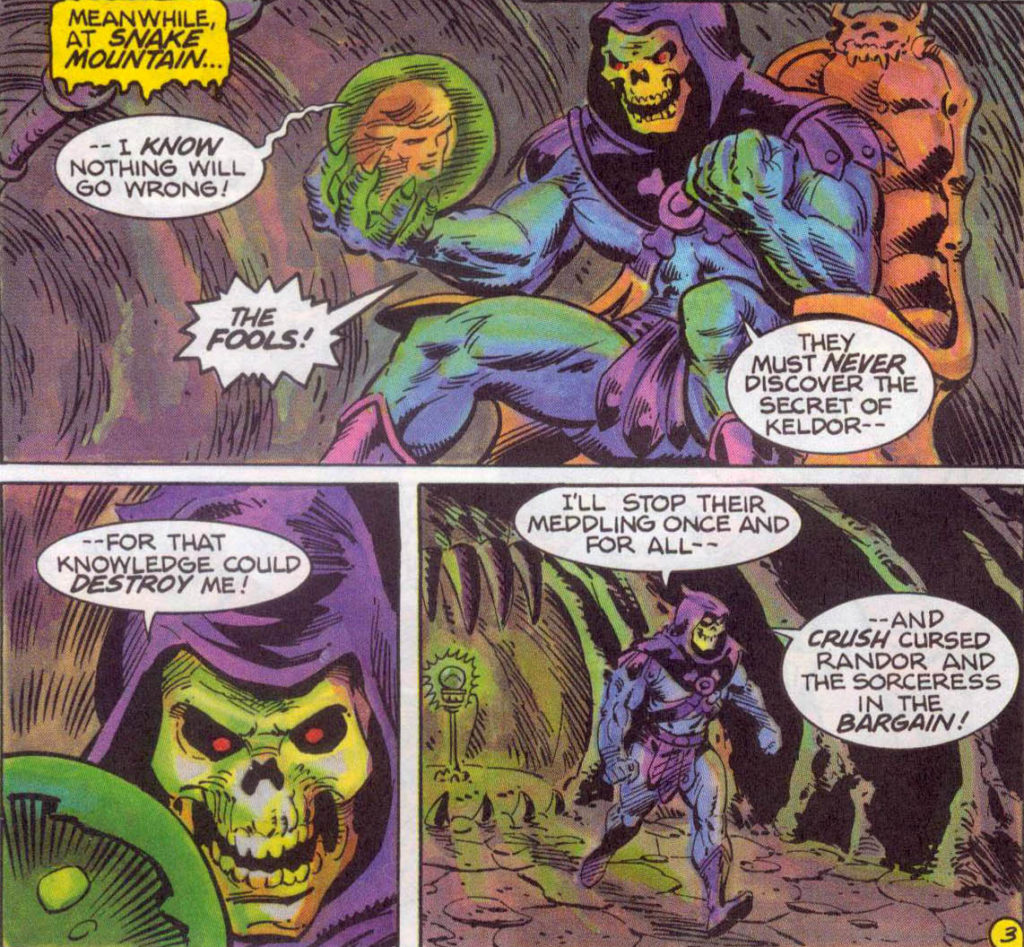 STEVEN GRANT: “As far as I remember, Keldor was Skeletor … But, I don’t think that was ever going to be revealed … I seem to remember it as one of those things Mattel came up with out of the blue … Slur Keldor and you end up with Skeletor … His backstory wasn’t really worked out. Some sort of evil cosmic energies altered him. I think they were going for a Darth Vader thing, but it was a tack-on.”
