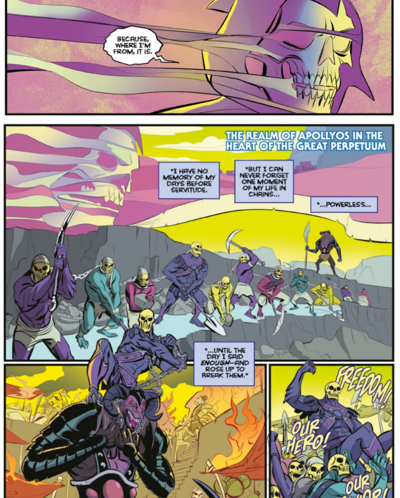 And in the second issue of the official “Masters of the Universe: Revelation” prequel comic series released by Dark Horse Comics (story by Kevin Smith & Rob David and scripts by Tim Sheridan – all writers from the show), we get to see the Demon Skeletor’s home dimension and Skeletor even having a family! But instead of the dimension remaining nameless, it’s referred to as “The Realm of Apollyos”.