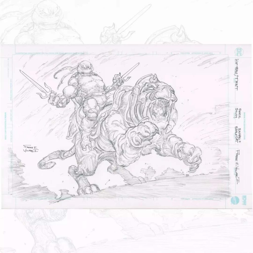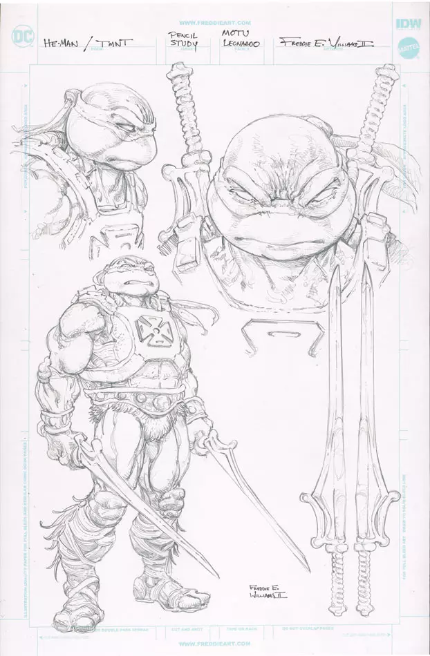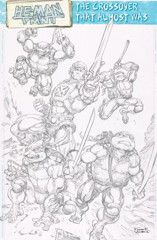 However over this month, comic book artist Freddie E. Williams II revealed a window into this failed crossover, when he announced a 64 Page Behind-the-scenes Sketchbook titled “He-Man/TMNT : The Crossover that almost was” for fans to purchase! He sold original pieces of this art before, but never in a reprinted collection!