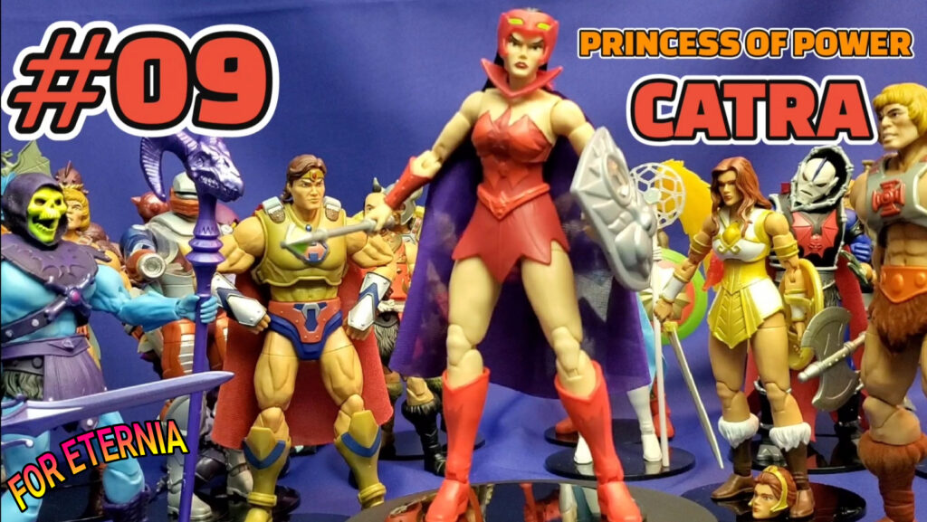 Catra from the Princess of Power subline in her ferocious feline Filmation inspired outfit looks absolutely purr-fect here. With two sets of black clawed hands, she’s ready to pounce on any prey that enters her territory. Donning Horde symbols on her chest as well as her belt, the Force Captain of evil has a purple soft goods cape, a green jeweled scepter and cat faced shield that completes her look.