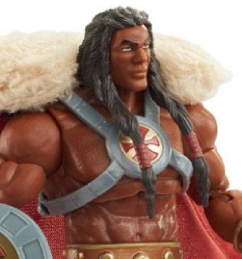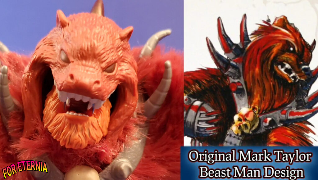 Inspired heavily by Mark Taylor’s original Beast Man conceptual art named “Ursis Prime”, with New Eternia Beast Man’s red colored bear head-like headdress, and armor with gigantic spikes, and a skull in the center of his massive chest, this Beast-Man is literally a BEAST! It’s a gigantic savage figure, extenuated only by its even more savage spiked club! Or perhaps it is spiked baseball bat, which is one heck of a brutal way to play baseball!