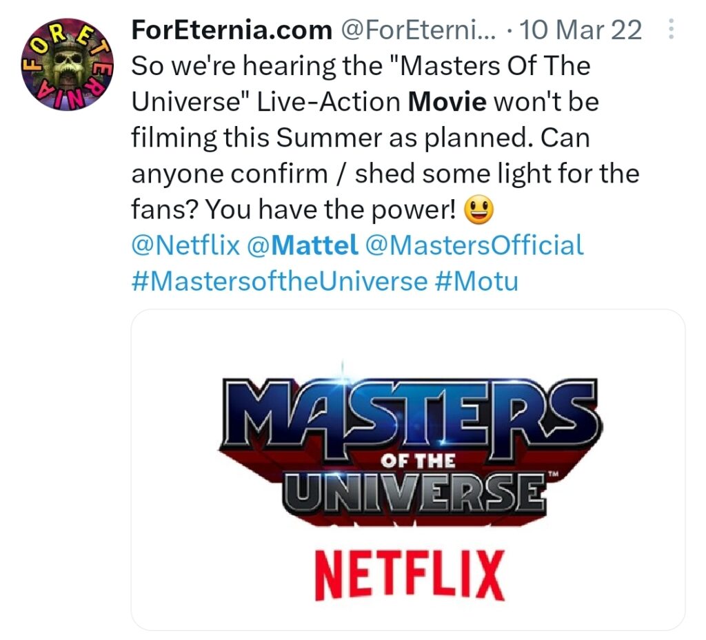 Now originally, the news broke about “Masters of the Universe” by Mattel themselves in January of 2022, where they indicated production was supposed to start that Summer of 2022, per their official press release:
