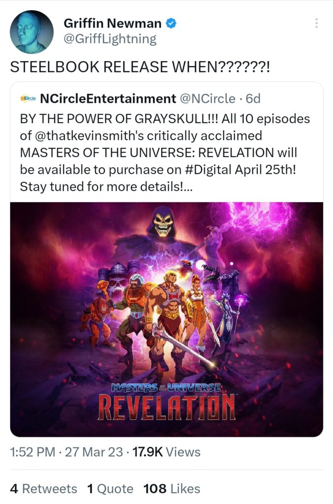 Fast forward to yesterday on Twitter, voice actor Griffin Newman who masterfully played Orko in “Masters of the Universe: Revelation” quoted NCircle Entertainment’s announcement and asked the question “STEELBOOK RELEASE WHEN??????!”