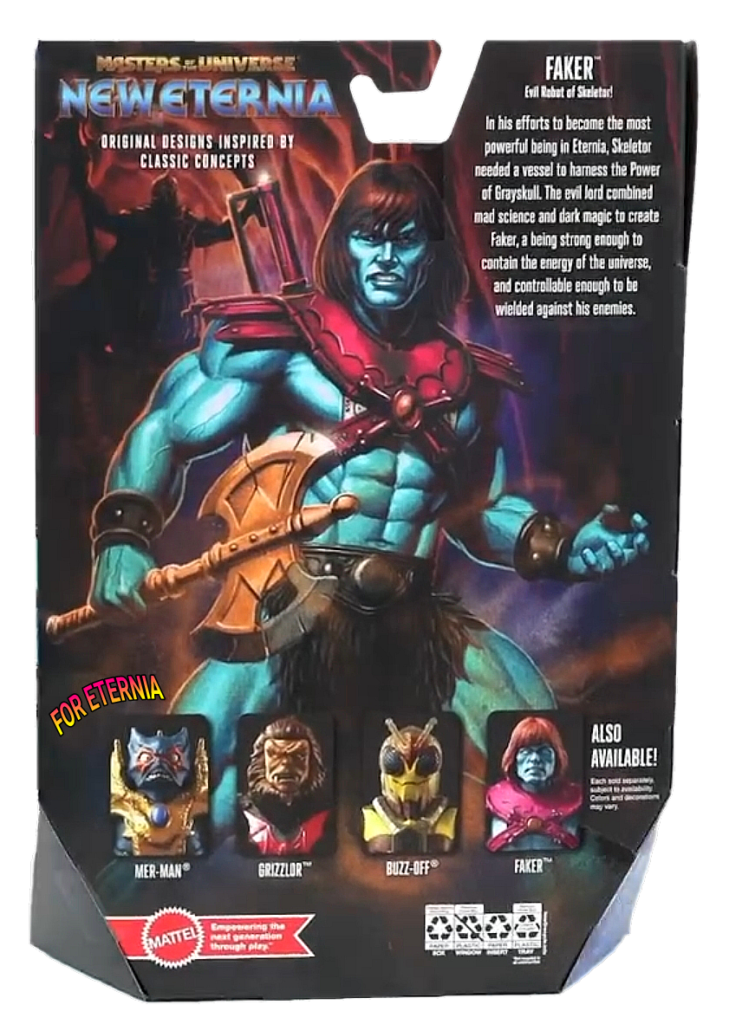 “In his efforts to become the most powerful being in Eternia, Skeletor needed a vessel to harness the Power of Grayskull. The evil lord combined mad science and dark magic to create Faker, a being strong enough to contain the energy of the universe, and controllable enough to be wielded against his enemies.”