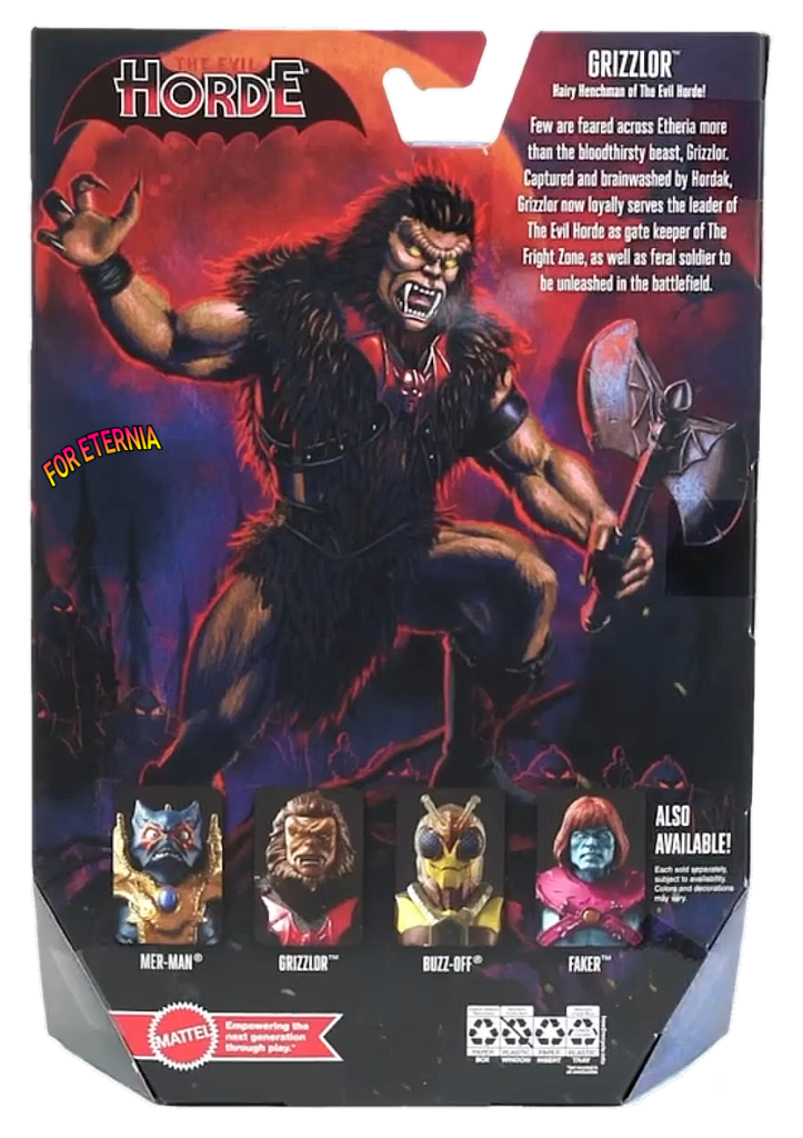 “Few are feared across Etheria more than the bloodthirsty beast, Grizzlor. Captured and brainwashed by Hordak, Grizzlor now loyally serves the leader of The Evil Horde as gate keeper of The Fright Zone, as well as feral soldier to be unleashed in the battlefield.”