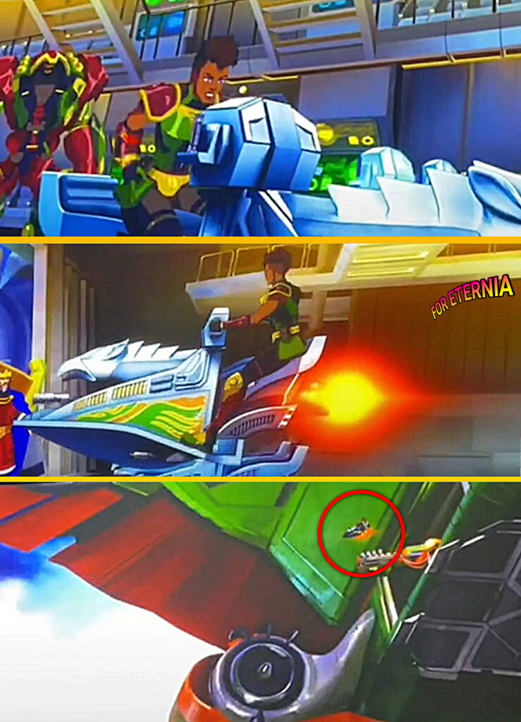 …one can see how truly humongous this warship is when we see the new Man-at-Arms, Andra, piloting a Sky Sled exiting the ship.