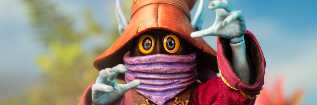 Our Orko 1/6 Scale Figure comes complete with a scepter and fabric robe as well as a slew of swappable hands and portraits, including the never-before-produced unmasked Orko. The figure also provides a first glimpse at Orko’s legs (yes, Orko has legs), and we’re honored that Mattel gave Mondo a chance to debut these expanded features.