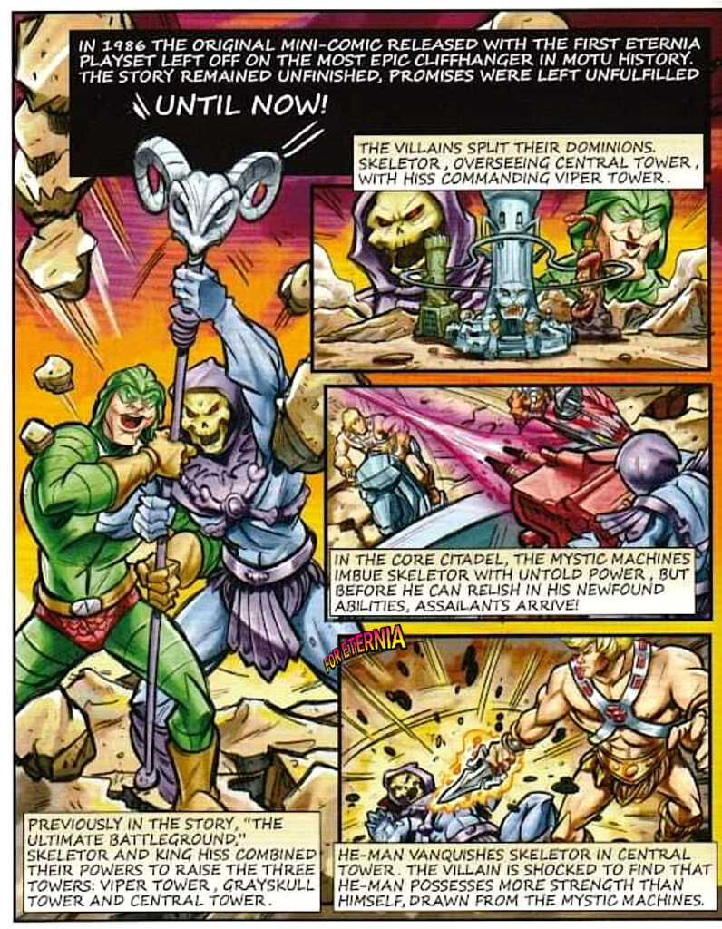Now back in 1986, the vintage Etenia playset came with its own minicomic titled “The Ultimate Battleground” which showed fans the hidden powerful history of Eternia’s buried three towers (as King Hiss and Skeletor hatched a plan to resurface them.)