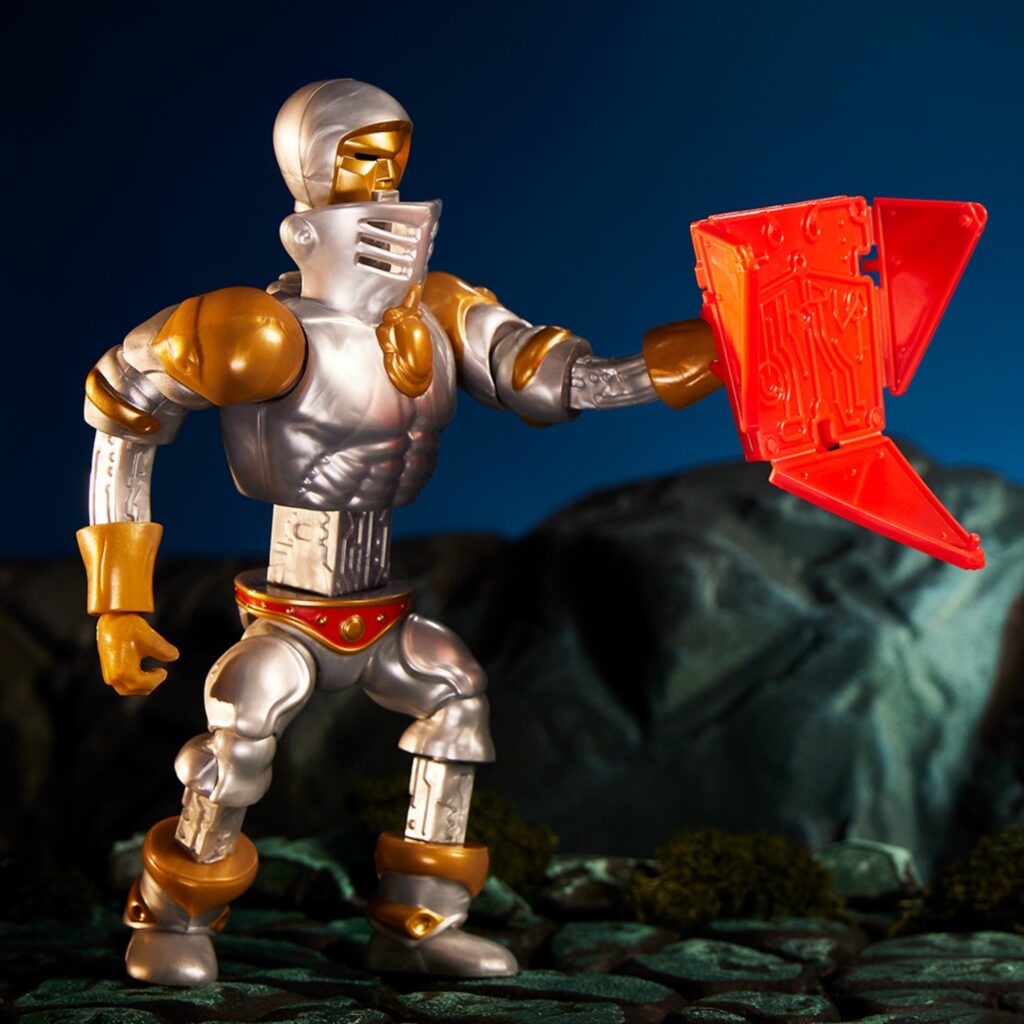 In addition to his extending body, our robotic knight has 16 points of articulation and wards off enemies with his folding shield.