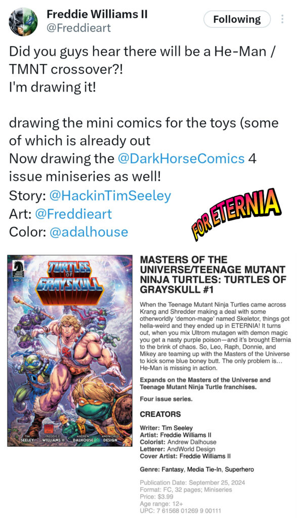 After doing art duties for the mini-comics from the “Turtles of Grayskull” Origins action figure line, Freddie E. Williams II took to social media today and revealed that he will be illustrating a four issue Dark Horse full comic miniseries for “Turtles of Grayskull” as well… written by the great Tim Seeley!
