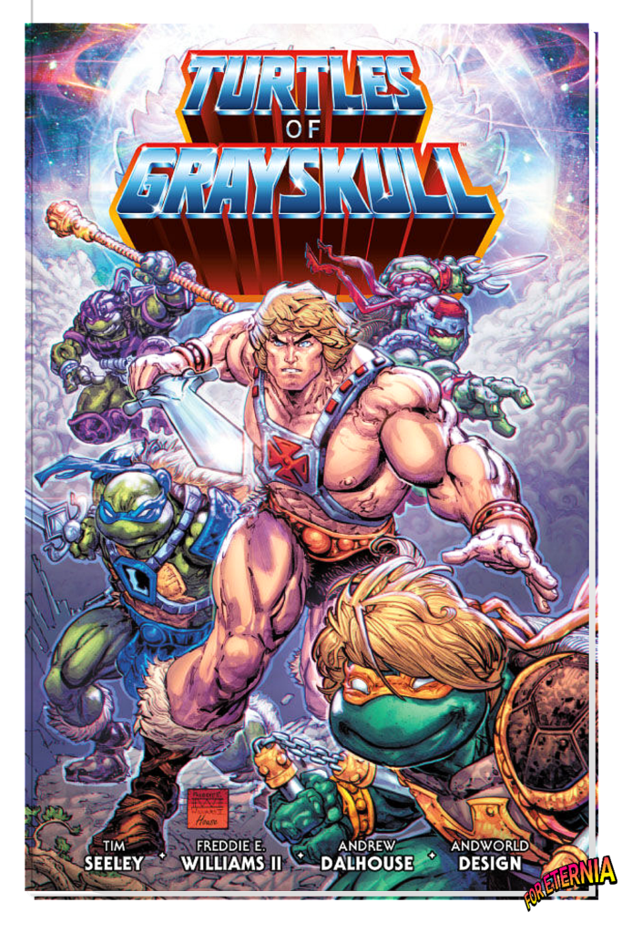 When the Teenage Mutant Ninja Turtles came across Krang and Shredder making a deal with some otherworldly ‘demon-mage’ named Skeletor, things got hella-weird and they ended up in ETERNIA! It turns out, when you mix Utrom mutagen with demon magic you get a nasty purple poison—and it’s brought Eternia to the brink of chaos. So, Leonardo, Raphael, Donatello, and Michelangelo are teaming up with The Masters of the Universe to kick some blue boney butt. The only problem is…He-Man is missing in action.