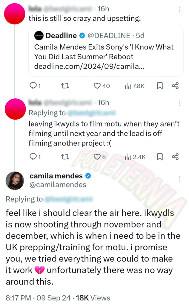 Camila Mendes revealed on X to an inquiring fan that she left the horror film reboot because she needed to begin prepping and training for the “Masters of the Universe” new live-action movie this November… in the United Kingdom!