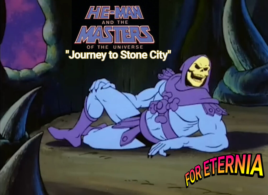 Using a screenshot taken from the classic “He-Man and the Masters of the Universe” 1984 episode titled “Journey to Stone City“, this frame of Skeletor on the ground was due to a fall (thanks to He-man punching the base of Snake Mountain).