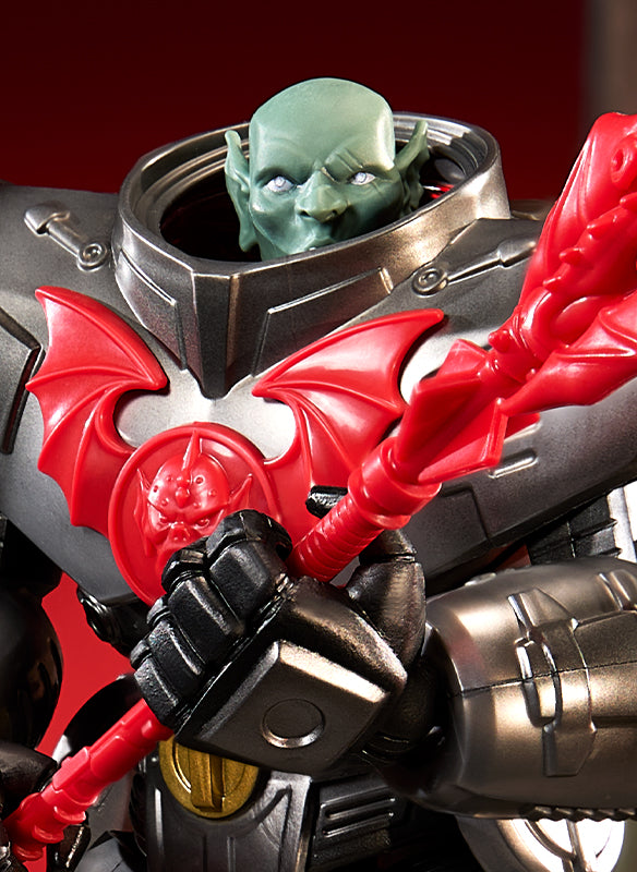 “The latest addition to our Masterverse collection is our largest army builder to date: the New Eternia Oversized Horde Trooper. Standing tall at 8.5”, our mechanical enforcer has removable body parts including legs, arms, and hands. He also comes ready for battle with a sword, a spear with articulated wings, and a backpack to hold all his weapons. But is the Horde Trooper humanoid or robot? His removable helmet solves this mystery once and for all, revealing the Horde Goblin inside the armor.