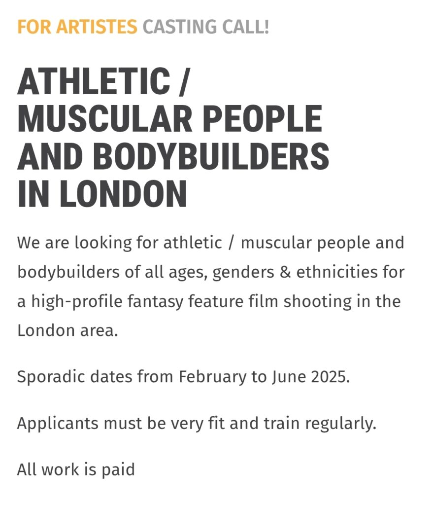 We are looking for athletic / muscular people and bodybuilders of all ages, genders & ethnicities for a high-profile fantasy feature film shooting in the London area.