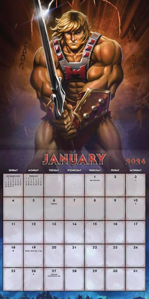 He-Man, She-Ra and the Masters of the Universe have staying power as one of the most favorite children’s TV franchises of all time. You have the power to organize your engagements with the 2026 Masters of the Universe Calendar full of space barbarians and princesses of power that appeal to children of any generation. Sixteen-month wall calendars feature monthly pages for January to December 2026, as well as a page combining the last four months of 2025. Each monthly page includes federal holidays and moon phases, with sufficient daily blocks for jotting down tasks and appointments to help you stay organized. Features 13 high-quality images printed on premium paper certified by the Forest Stewardship Council. Perfect for hanging on your wall, corkboard or bulletin board at home, school or the office.