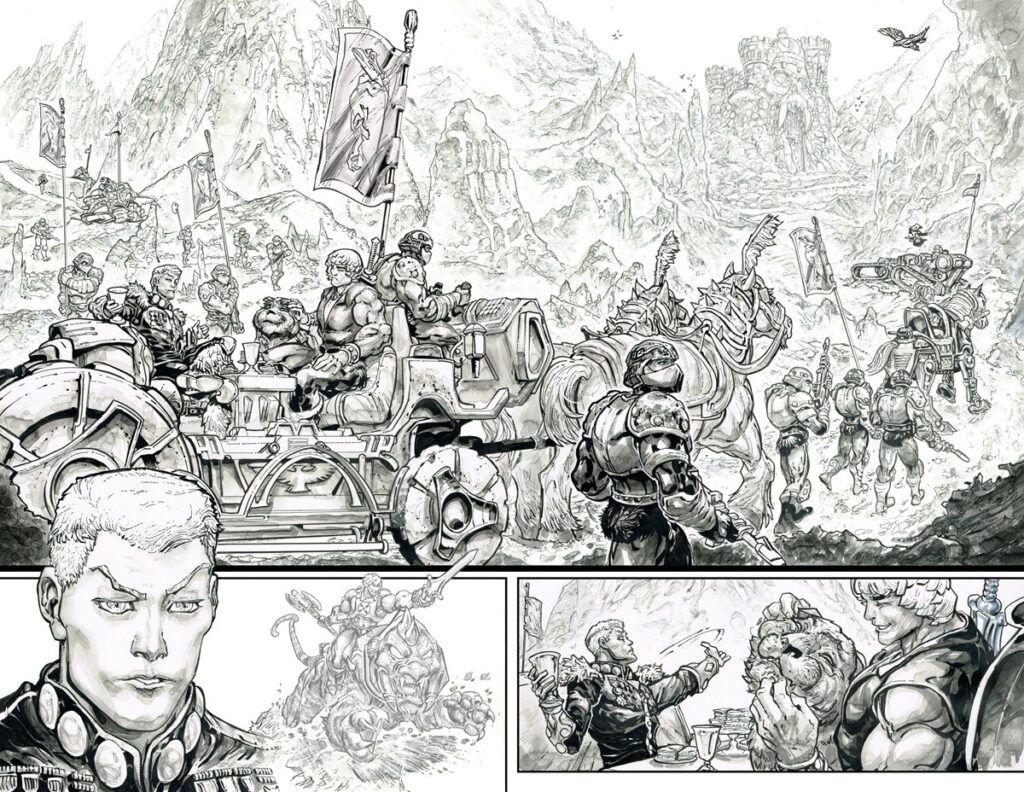 The classic cartoon is still the biggest phenomenon that fans all over the world remember, so as we’ve seen the previous comics – some settings are pulled from it. But the characters themselves look more vintage toy inspired (some details brought in from Classics toys). And they might make references such as characters talking about a notion of He-Man as this barbarian from the mountains, so hints of Glut comics.