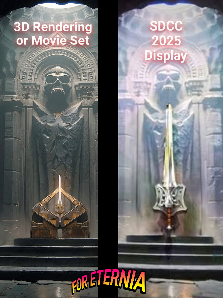 Is the above image from Mattel the movie interior of Castle Grayskull? Since it was paired with the Power Sword movie prop at Comic-Con it very well could be. We also noticed the uniquely different looking Power Sword was digitally erased when the movie prop was displayed against it. Check it out: