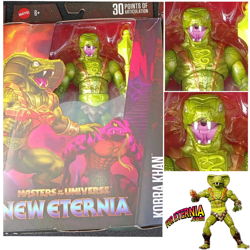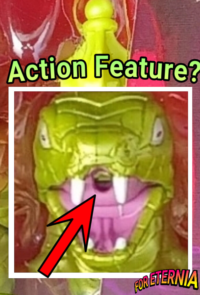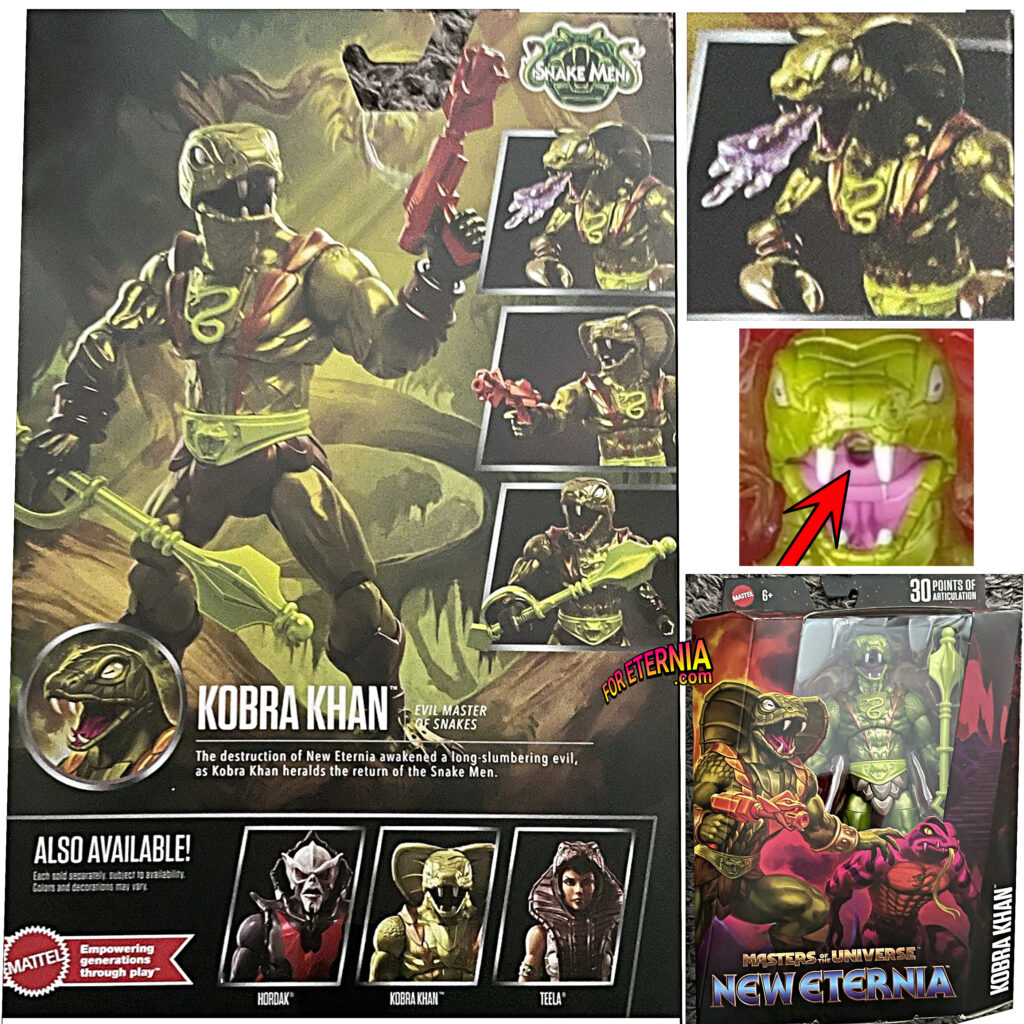 💧Confirmed: No Action Feature 💧 Finally getting a look at the back of the packaging for the upcoming Masterverse “New Eternia” KOBRA KHAN Figure, the hole in its mouth is not for an action feature (like the vintage toy) but rather to insert a plastic spray effect. 💥 Thanks to the awesome PrincesseValha1 for the ‘heads up!”