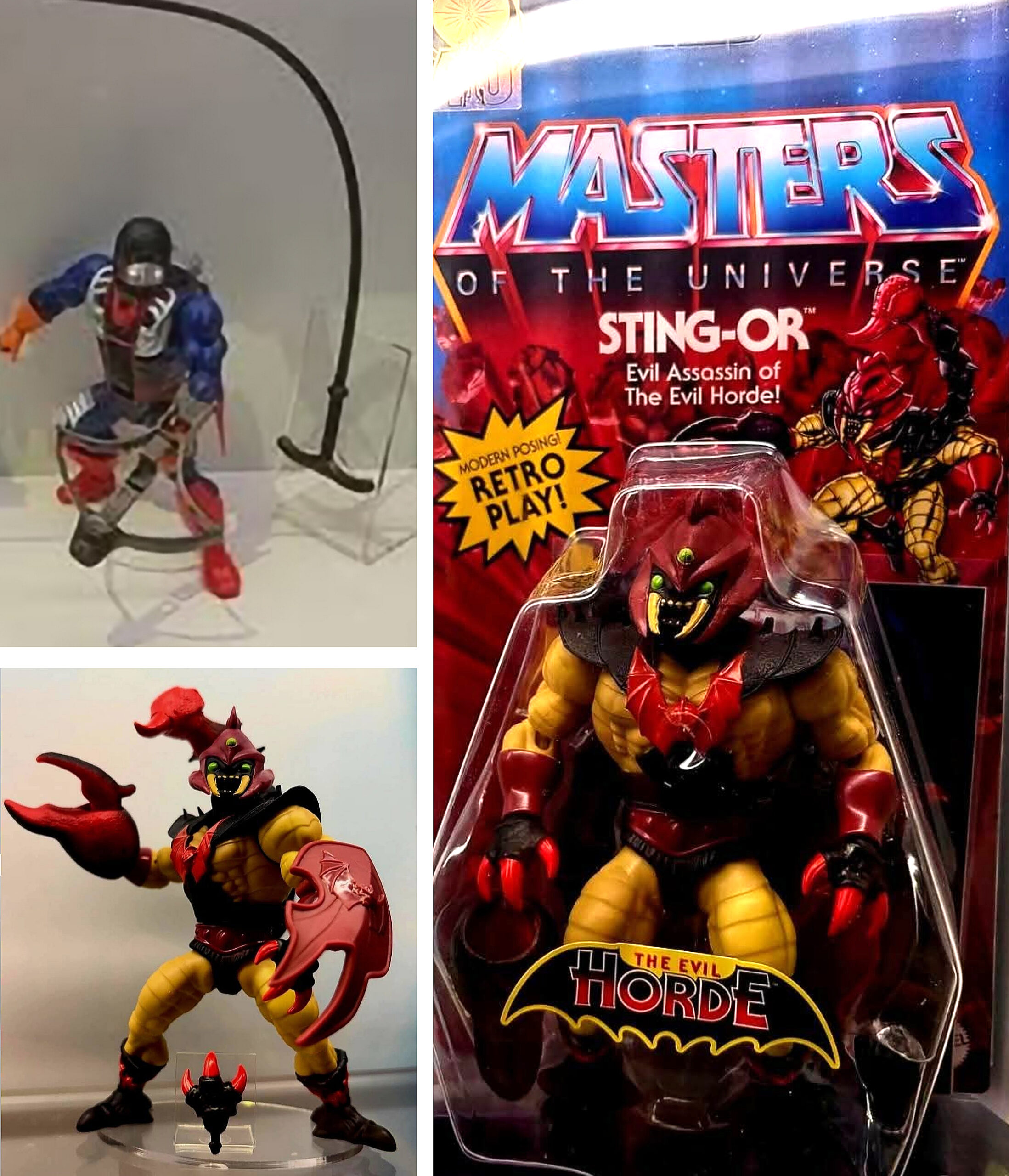 So Sting-Or uses King Hiss arms and legs, Hordak shins, Buzz-Off feet, ToG Leatherhead’s body, the trunks are from Leatherhead or Reptilax, Modulock’s hands and MOTWWEU Sting’s claw.