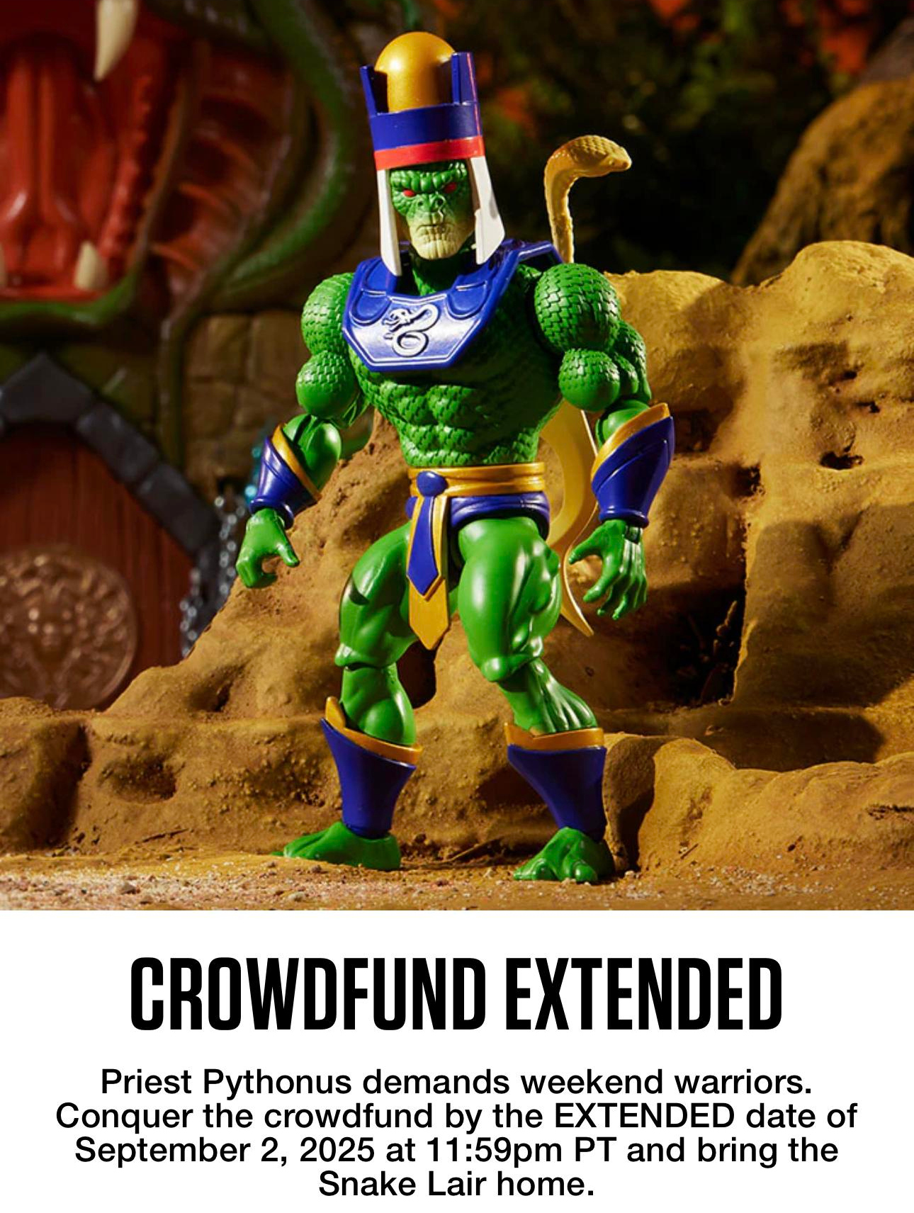 Already successfully funded and slated to end August 28th, this extension of the Origins Snake Lair crowdfunding campaign appears to be an effort to attract additional backers in the hopes of unlocking the Priest Pythonus Origins Figure (at 8,000).