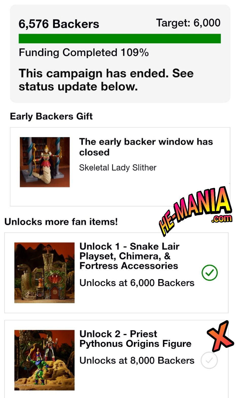 While there were ultimately enough backers to support the manufacturing of the actual Snake Lair, the bonus action figure Priest Pythonus was not so lucky, falling 1,424 backers short of unlocking the figure (even with Mattel extending the crowdfunding period.)