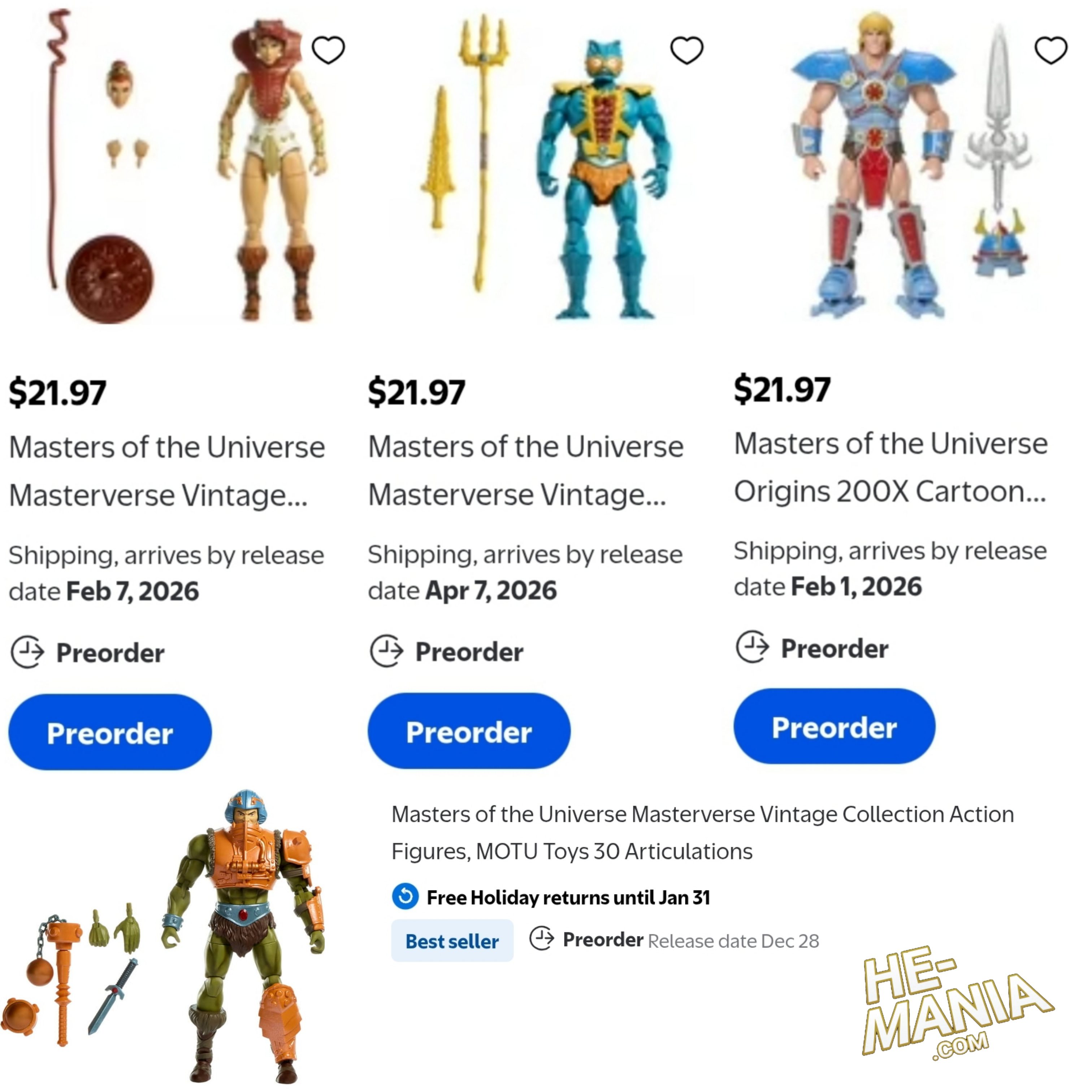 First, thanks mostly to the Walmart Collector Con, an assortment of new Masters of the Universe figures are now available for pre-order including three Masterverse Vintage Collection figures: