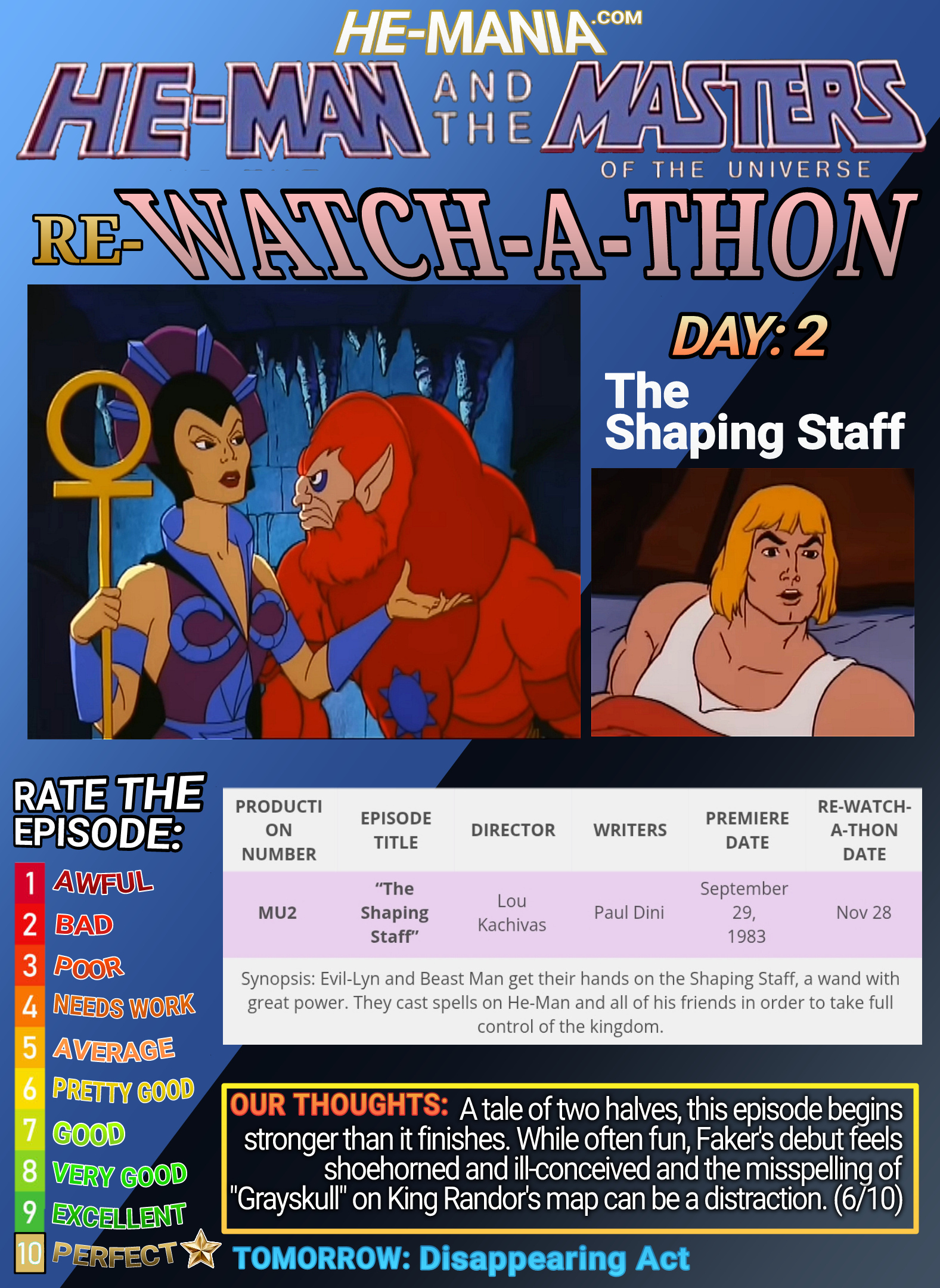 A tale of two halves, this episode begins stronger than it finishes. While often fun, Faker's debut feels shoehorned and ill-conceived and the misspelling of "Grayskull" on King Randor's map can be a distraction. (6/10)