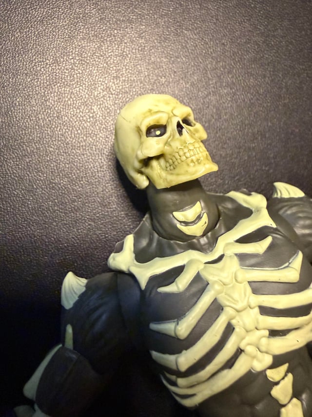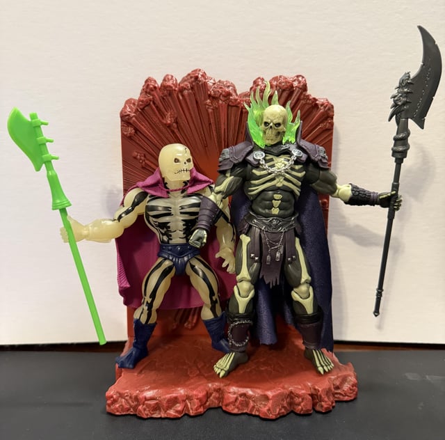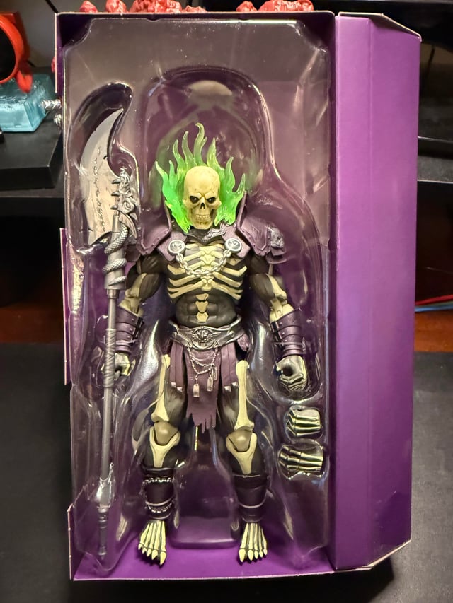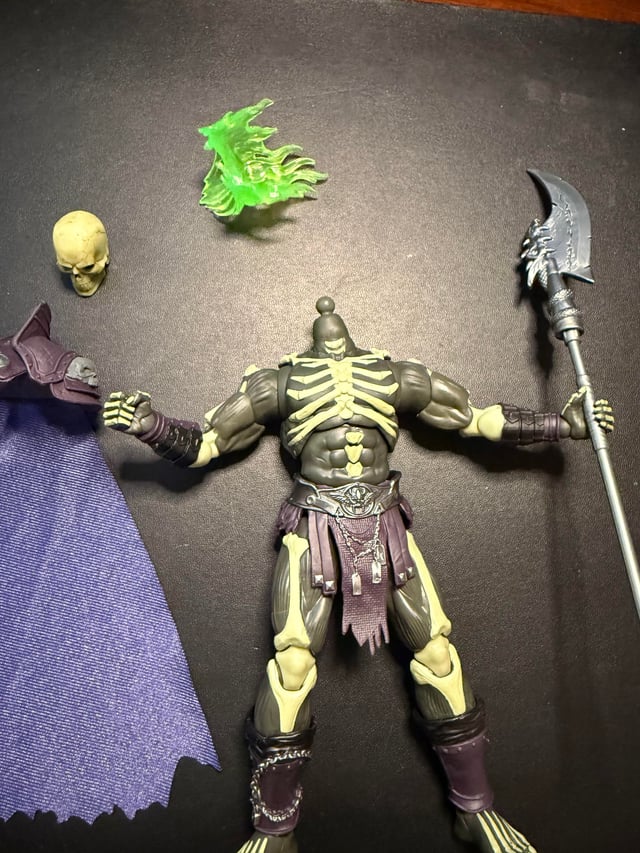 I like the scale and the design a lot. The joints are kind of perfect, especially compared to how stiff most of my recent Masterverse and Origins figures have been lately. Very fluid movements, but everything stays where you put it when you put it there. I dig the green fire effect around his head. Based on the paint color, I didn't expect him to glow in the dark at all, but I did a quick bit of experimenting, and it seems like at least his head does, so it's possible that his bones do too, since they look to be the same color. The cape fabric is very thin, but I'm glad I was able to remove the tape from it without leaving a lot of sticky residue like often seems to happen (looking at you, Keldor). I'm a little disappointed that there's no accessories besides the halberd and two alternate hands; I feel like the 200X Cartoon Collection figures are a real downgrade in terms of accessories (one accessory in monochrome plastic and no minicomic?) and this feels like more of that trend compared to what comes with some of the New Eternia and Vintage Collection figures.