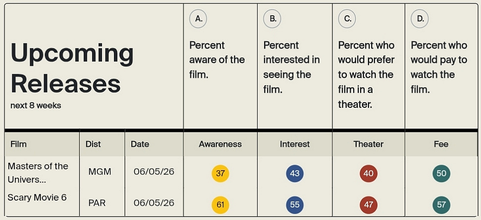 …the new Scary Movie film is tracking better than Masters of the Universe in four categories: Awareness, Interest, if people want to watch it in the theater and if they would pay to watch the movie.