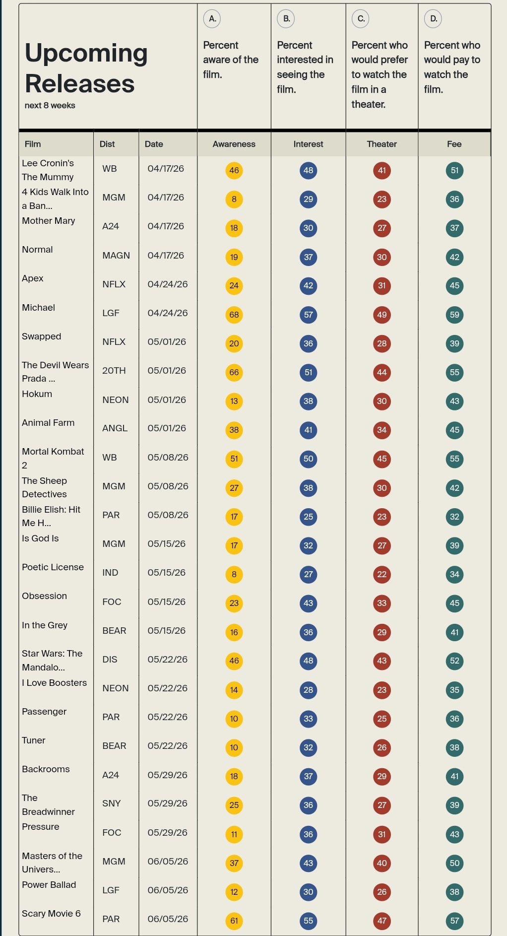 Metrics are a bit weird. 37% of those polled are aware of the film with 43% interested in seeing it and 50% believing it should be seen on the big screen..uuhhh oook.