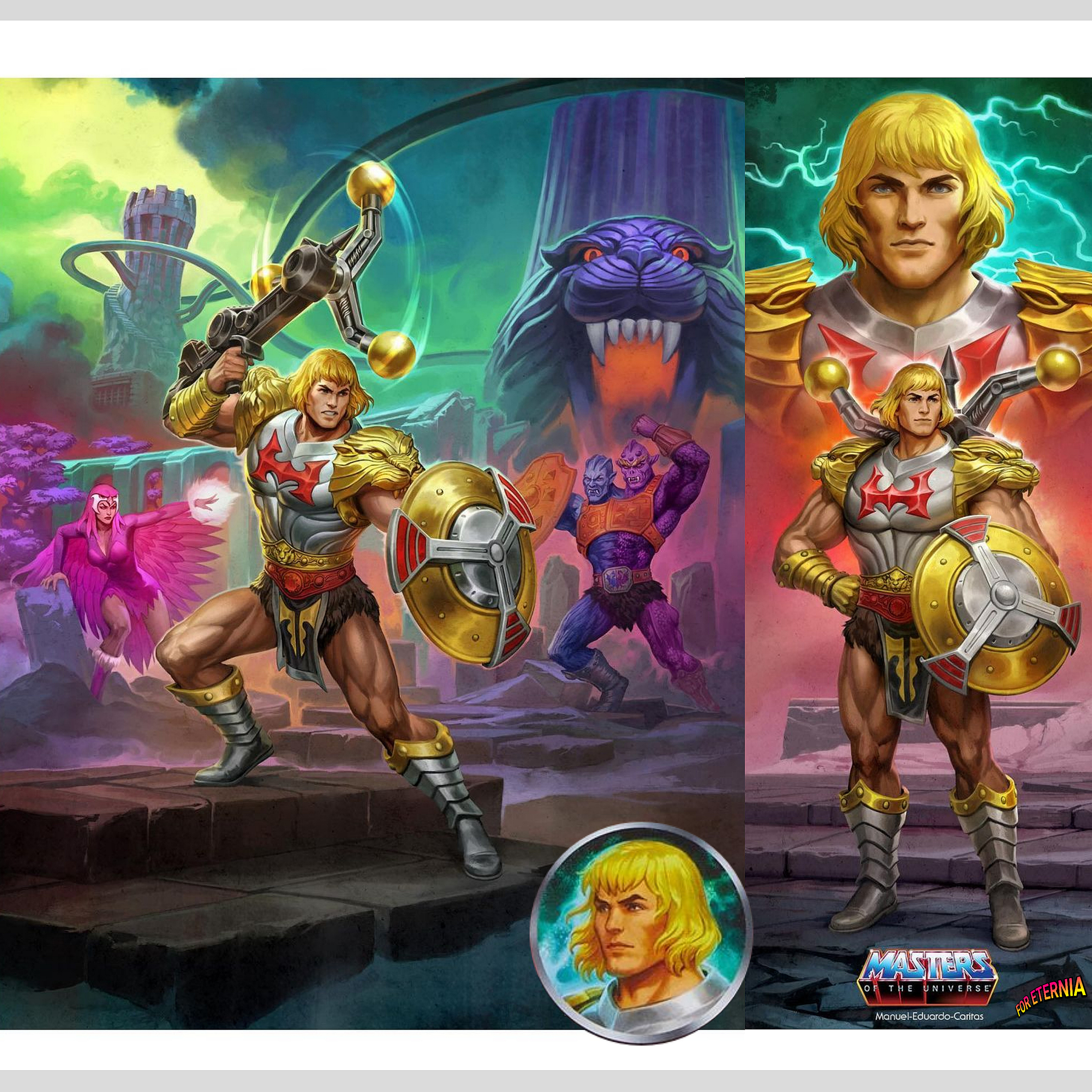 The Complete Set of Masterverse Masters of the Universe "New Eternia" FLYING FISTS HE-MAN illustrations by artist Simon Eckert 🎨 (and courtesy of Roy Juarez.)
