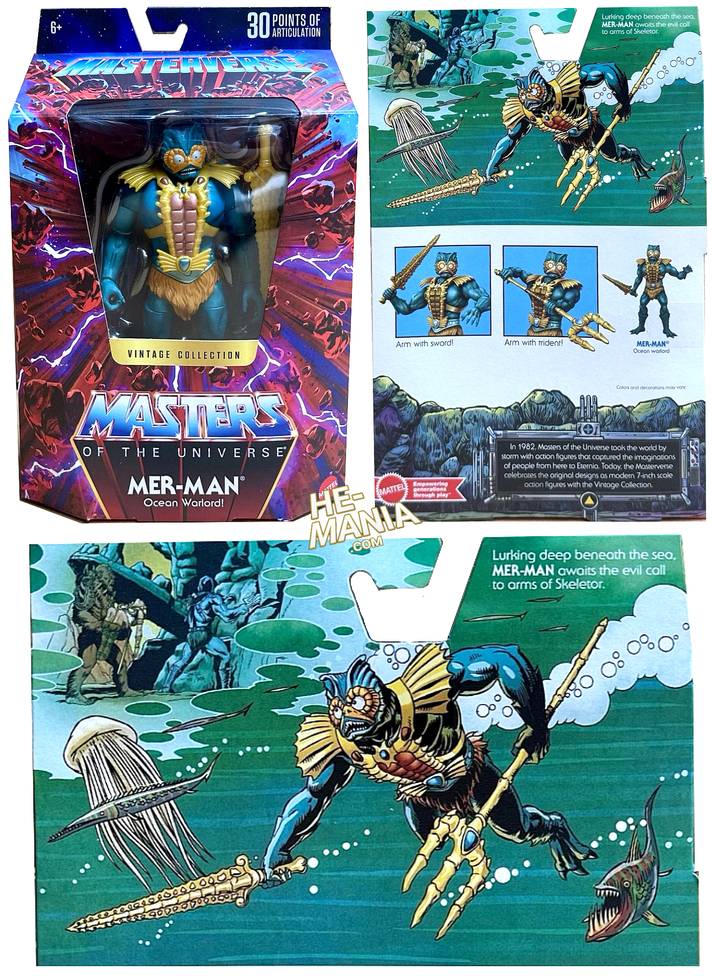 A look at the full packaging for for the MASTERVERSE Masters of the Universe “Vintage Collection” MER-MAN Action Figure.