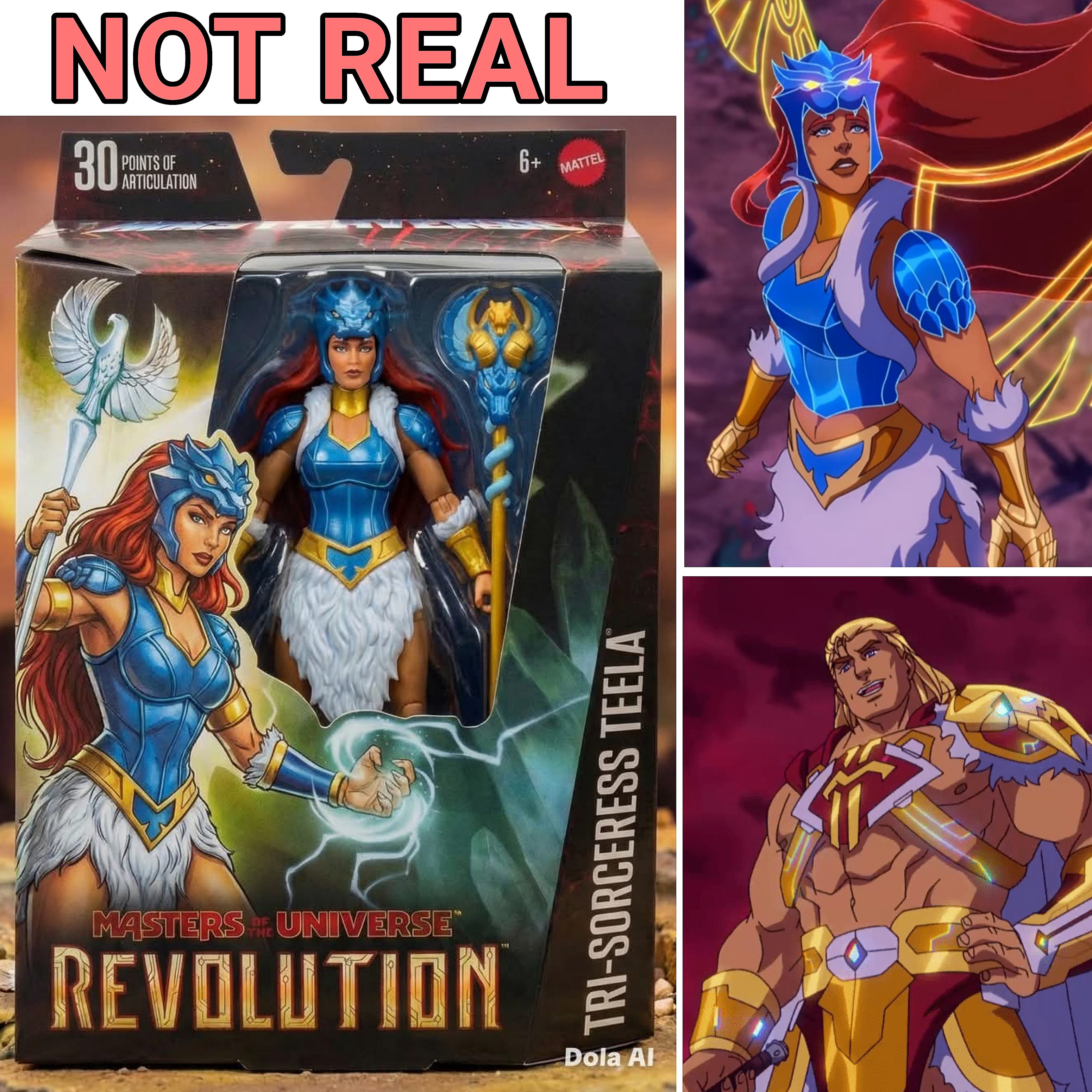 While there are several AI generated Masterverse figures circulating the community, it will be ultimately a great disappointment if we never see the Tri-Sorceress and (Uber) He-Man from "Masters of the Universe: Revolution" subline realized in Masterverse plastic. (Thanks to Raúl)