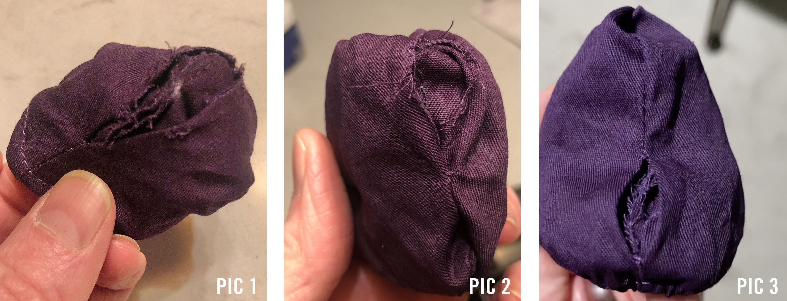 When I opened my Mondo Skeletor the cloth hood “tip” (that’s stitched down and to the back) was stitched SUPER crooked. It also seemed to interfere with some of the posing of the hood. So it snipped the stitch. I was pushing the interior out to try and get more volume at the base. I noticed something felt off. So I turned it inside out. The stitching was totally torn at the seam. Straight from the factory! (See Pic1)