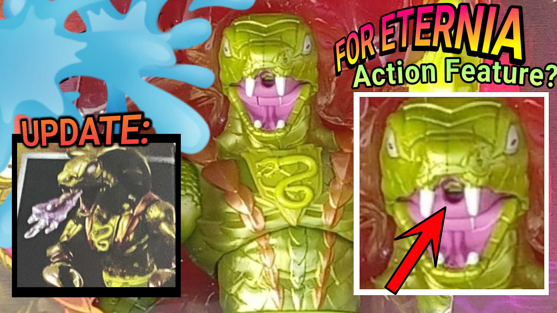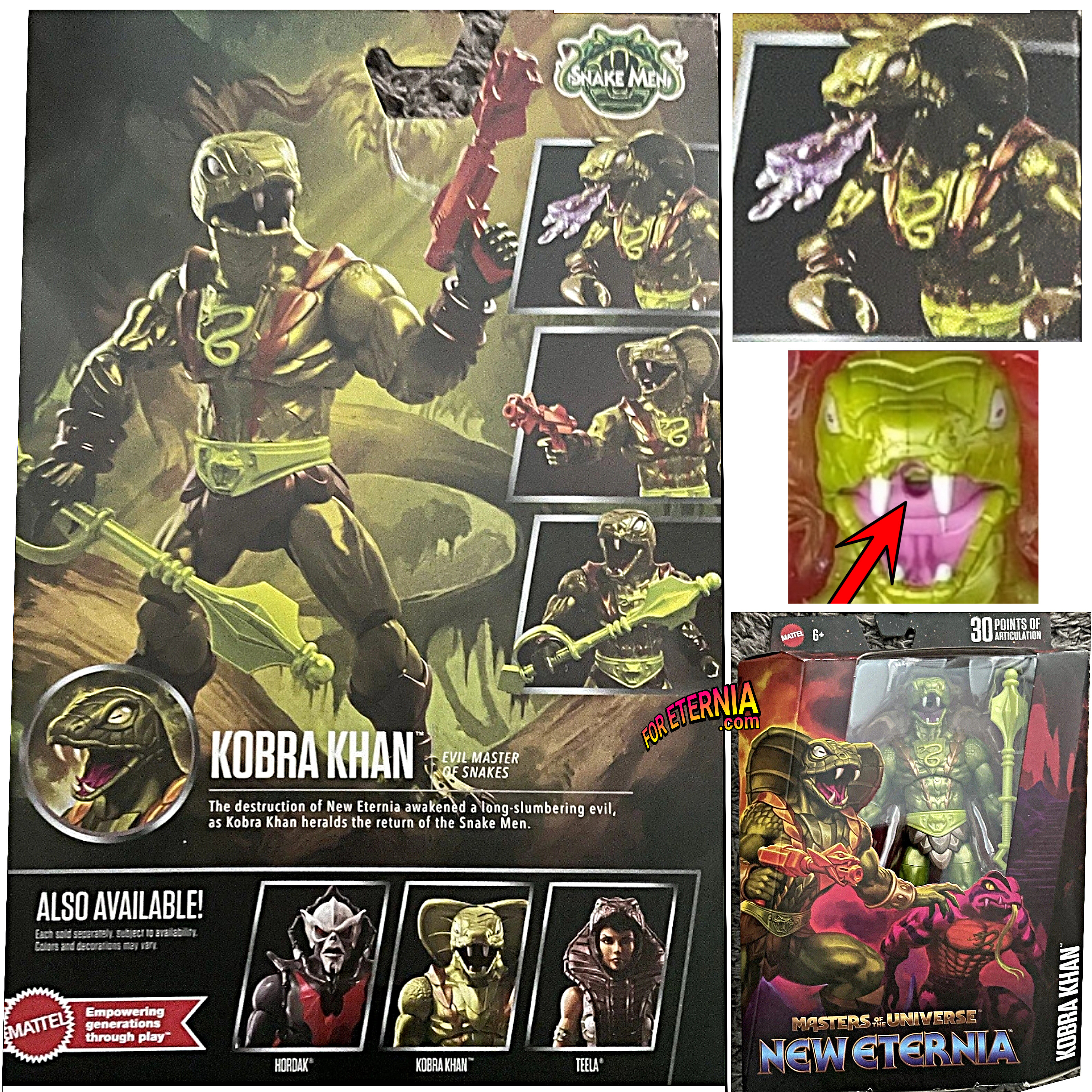 Today we received our first *partial* look at the upcoming Masterverse Masters of the Universe “New Eternia ” Kobra Khan action figure in packaging. Listed on the e-commerce website eBay for a substantial markup, what really caught us by surprise is a reveal of a possible action feature. If you look closely at Kobra Khan's mouth, it reveals a hole! Could this hole be used to spread venomous poison, just like the vintage figure? Vintage Kobra Khan cardback action feature instructions Stay tuned to find out! UPDATE: 💧Confirmed: No Action Feature 💧 Finally getting a look at the back of the packaging for the…