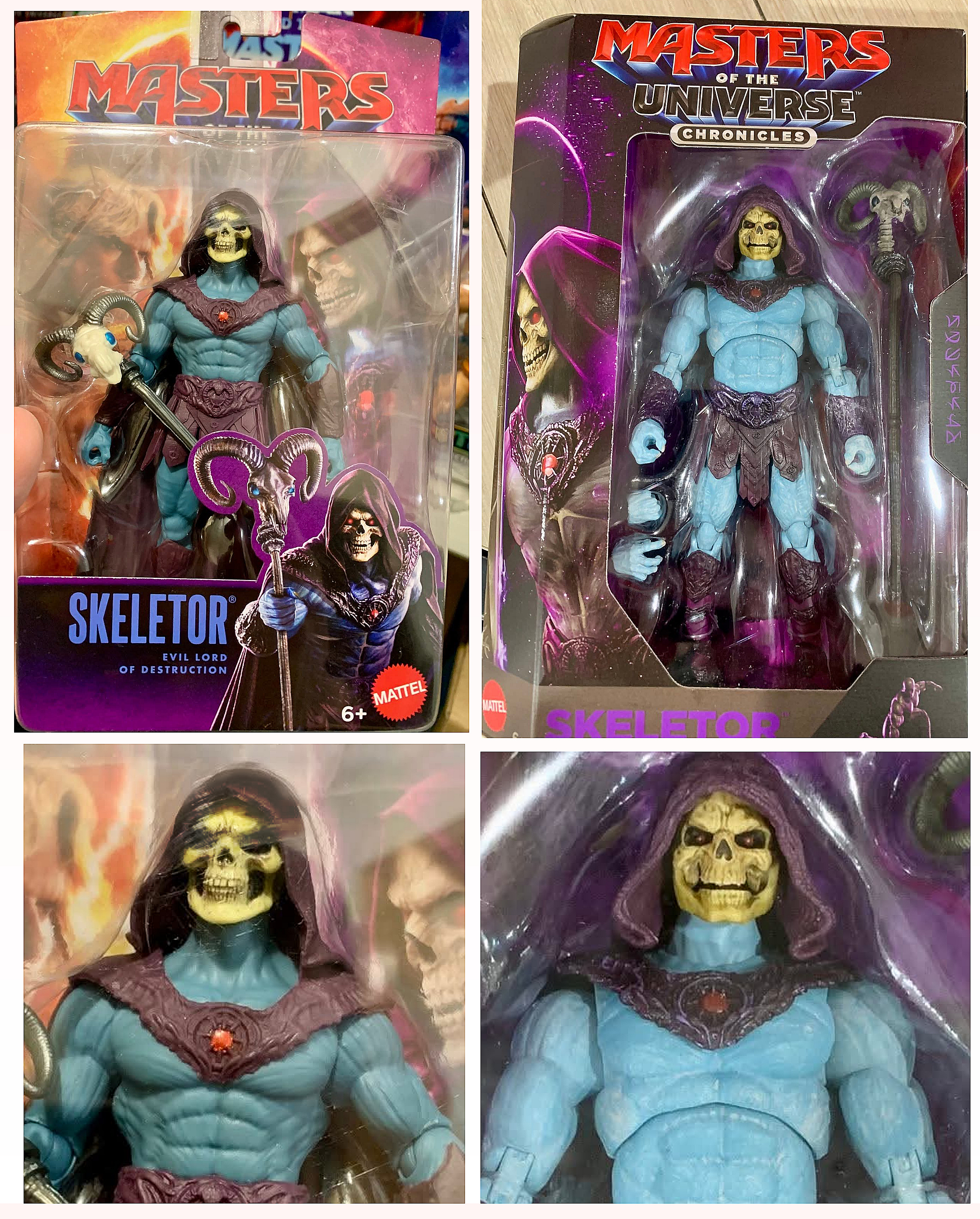 Comparing in-hand packaging images of the "Kids/First Ones/Core" Masters of the Universe Movie SKELETOR action figure with its "Chonicles" counterpart. (Thanks to Heyday and Damian!)