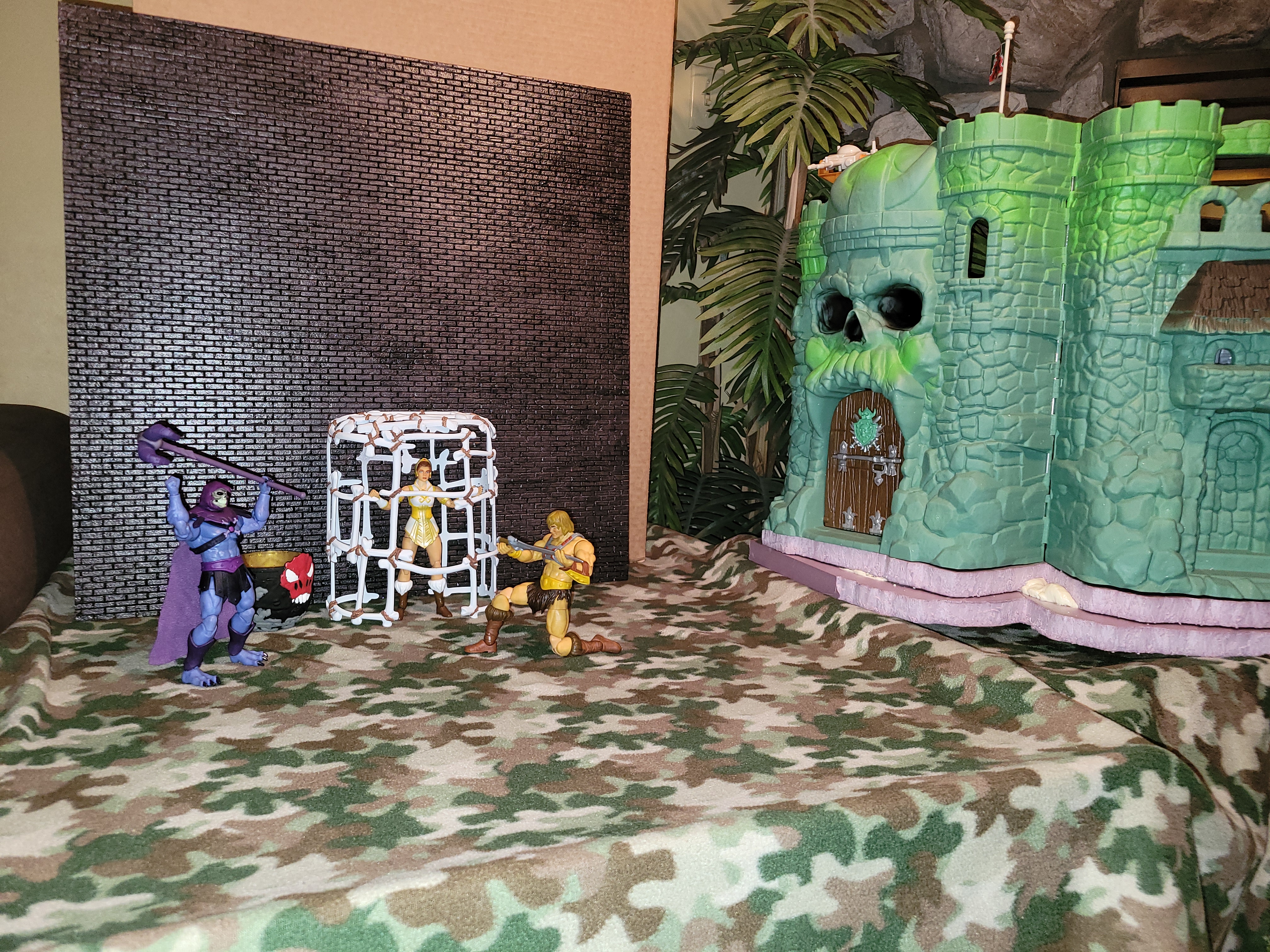 Thanks guys. We made that brick wall in the background, just need to finish painting it up. I have some fake grass coming in the mail hopefully soon so can actually start building up the diorama. In this pic you can see the base I'm also working on for castle grayskull. Plan is to have grayskull on one side and Snake Mountain on the other, with a battle going on in the middle. This is also just a quick setup in the living room trying to figure out sizes and all that.Β