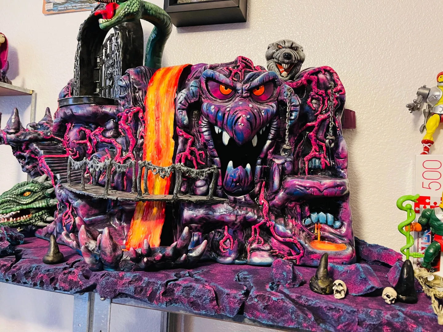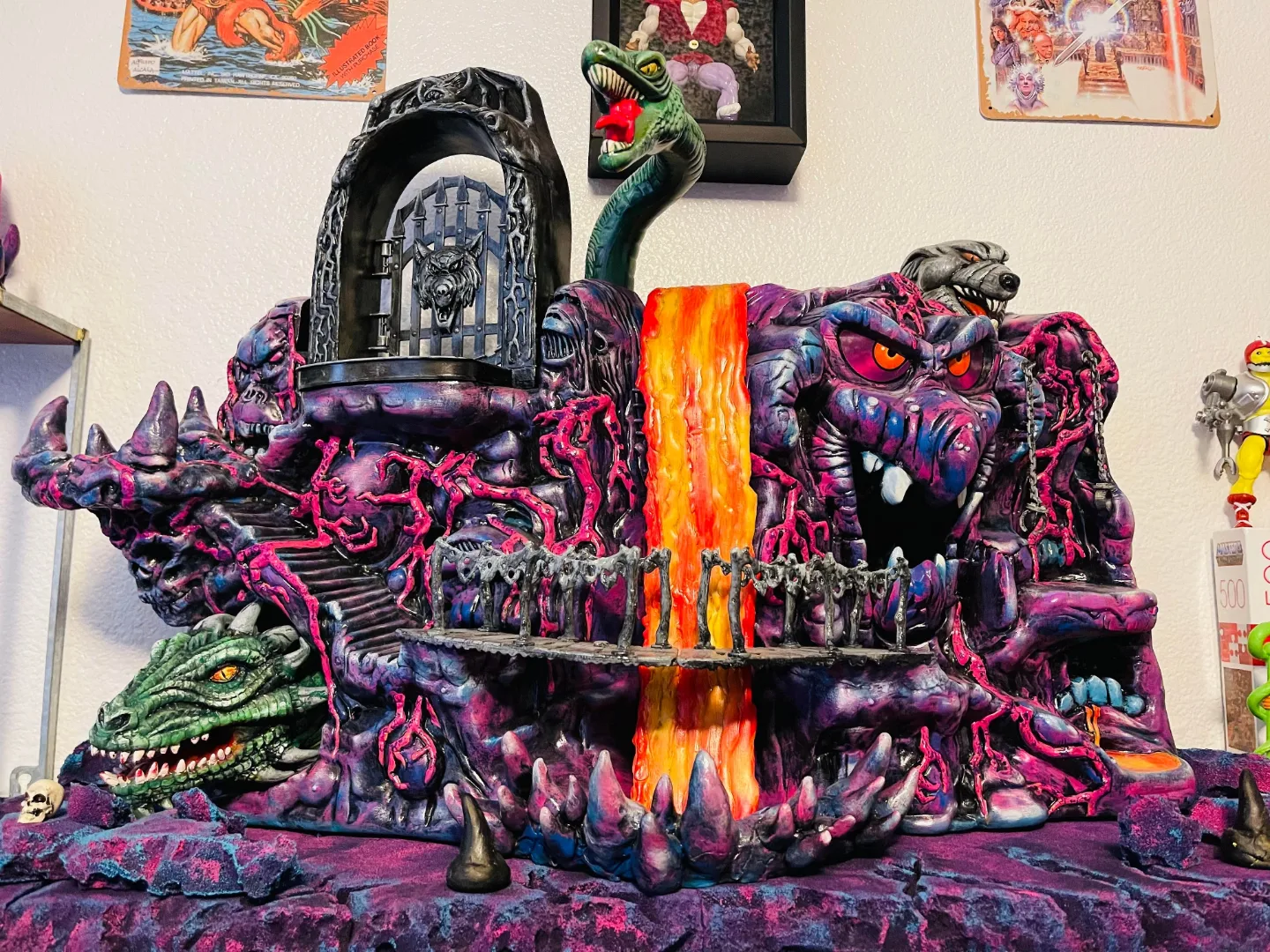 A little behind-the-scenes info: Sam used air dry clay to raise and stabilize the bridge and create the much larger landing with spikes, as well as the creation of the spikes around the lava. The lava itself was made with a hot glue gun (so cool!) And the paint used was acrylic.