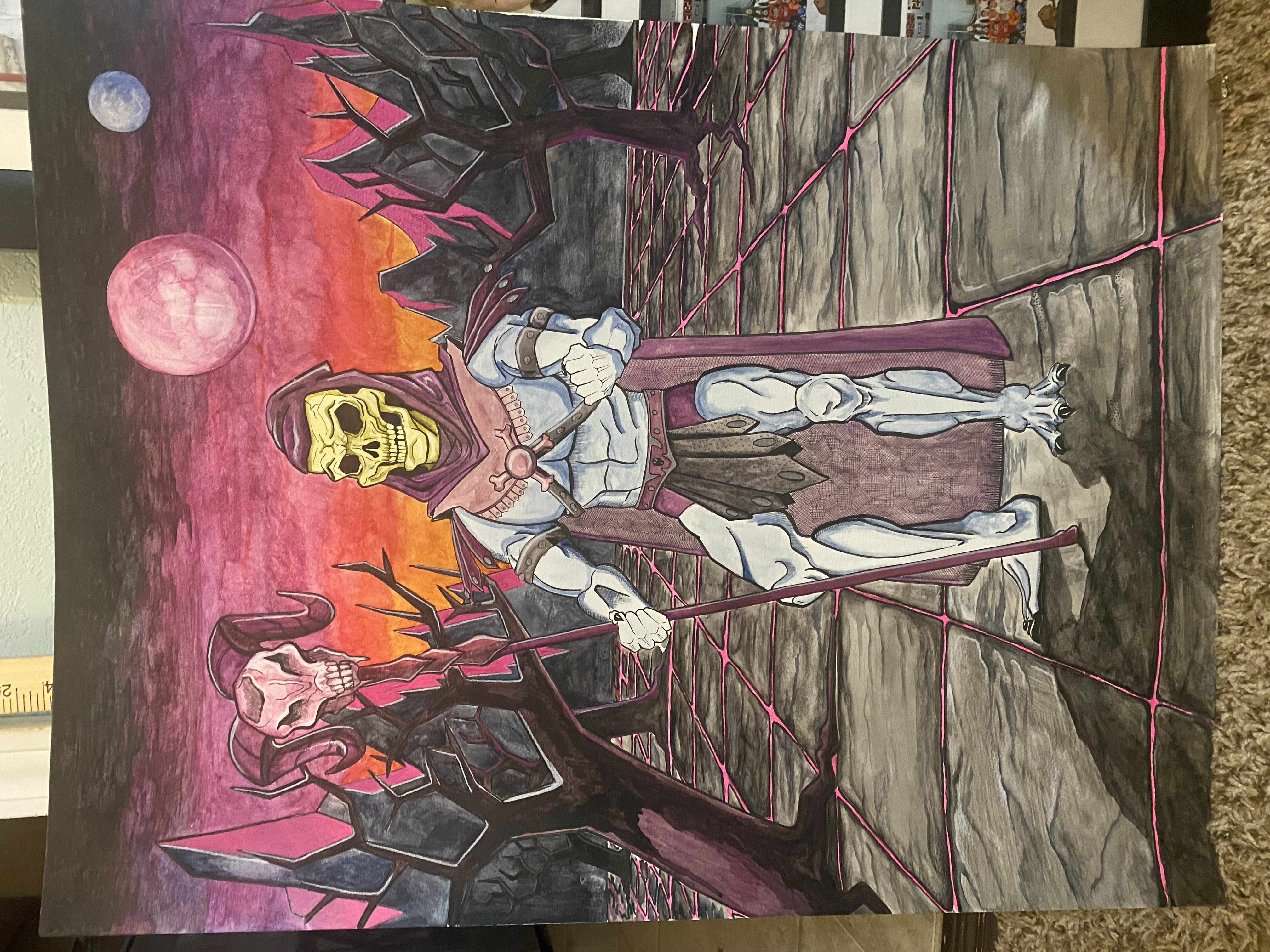 Hi! I wanted to share this Skeletor pencil art I've been working on. Its eventually going to be a watercolor/ink picture. The background is inspired by 80's grid graphic backgrounds but instead of mountains I am doing Fright Zone trees, and I would like to add some planets to make it look like the skies above Eternia. Does anyone have any resources about what other planets would be visible in Eternia's sky?