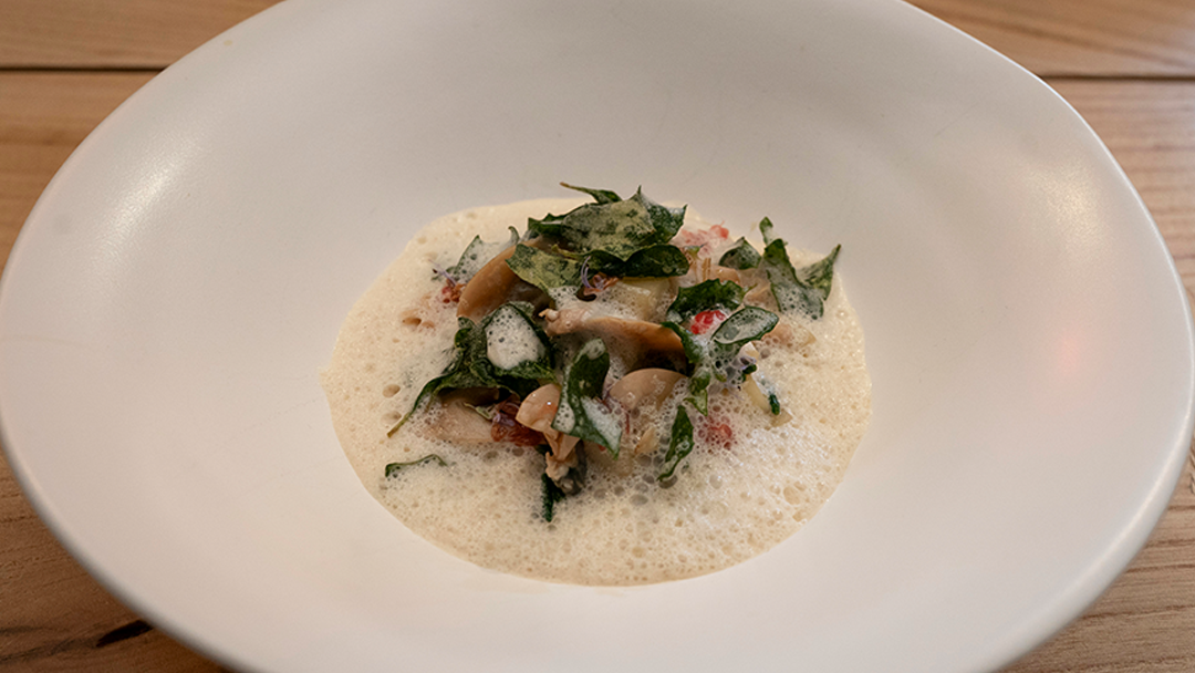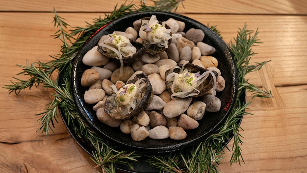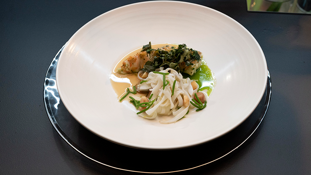 Callum made Potato & Rosemary Oysters. The oysters were not real oyster shells, Callum made them out of Potato Starch, Squid Ink & Oyster Liquor. His other elements included Bacon & Rosemary Glaze, Lemon & Mandarin Gel, Potato Noodles, Rosemary Salt, Smoky Oyster Mayonnaise, Rosemary Tea, & Rosemary Apple Garnish.