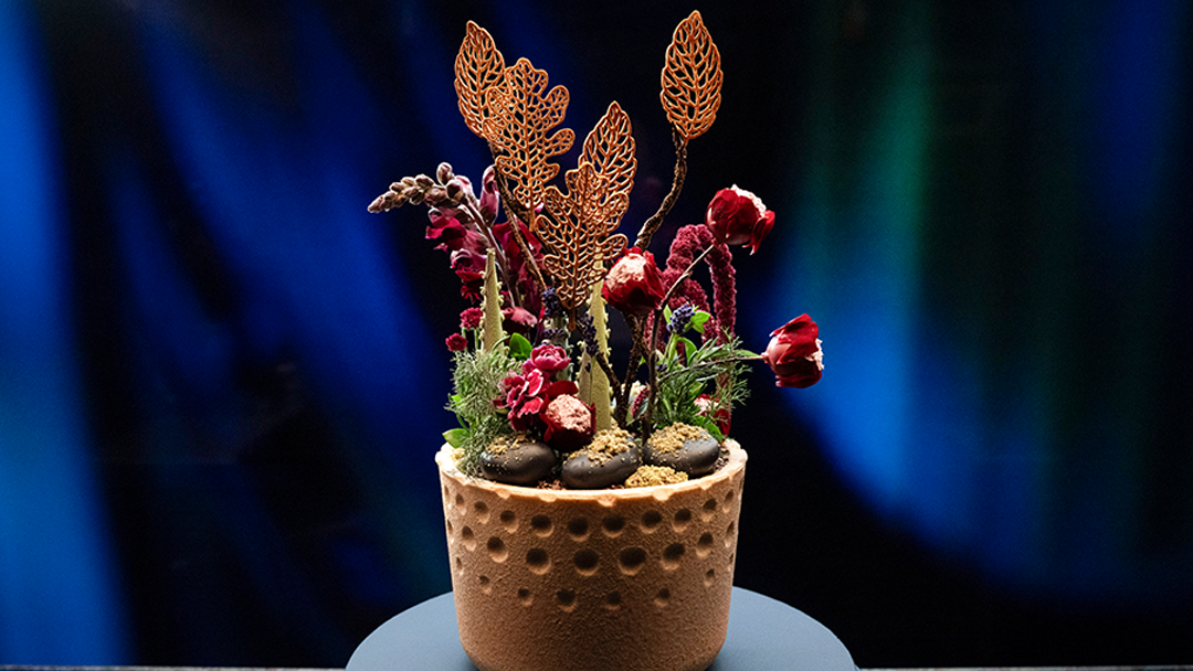 Botanic Garden: Chocolate Pot, Rice & Cacao Nib Soil, Profiteroles, Creme Anglaise, Earl Grey Mousse, Gourmand Glaze, Mandarin Ganache, Moss Crumble, Raspberry Ganache, Aloe Vera Gel, Black Chocolate Dip, Chocolate Cones, Chocolate Twigs, Lollipop Dust, Tuile Leaves, Raspberry Chocolate & Edible Flowers.