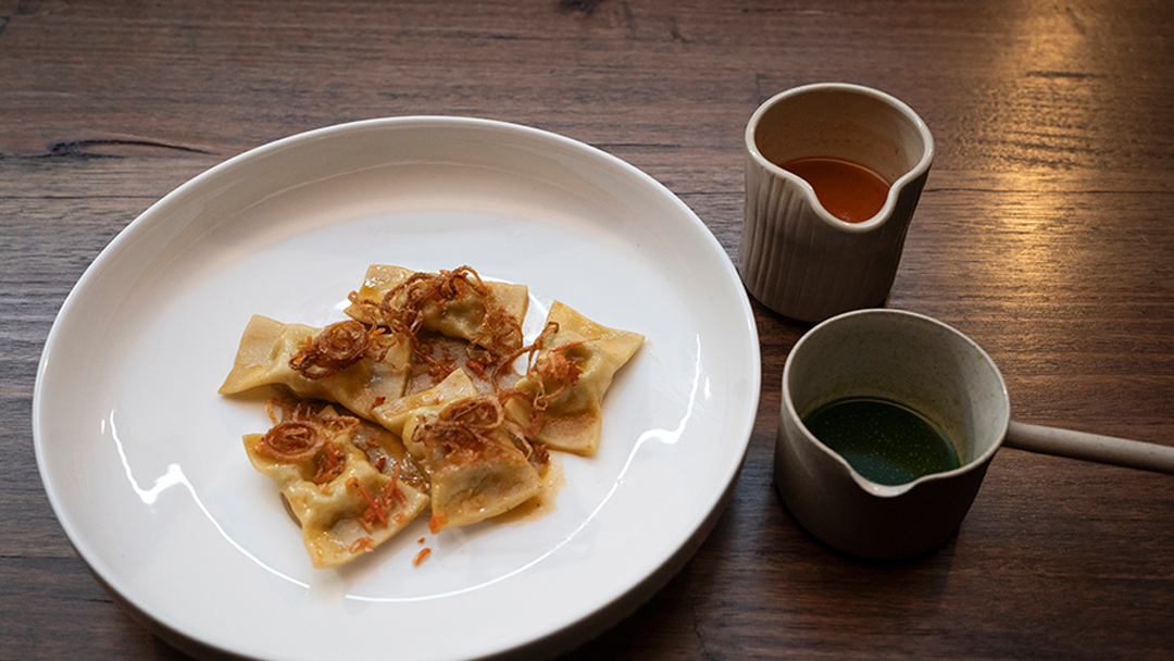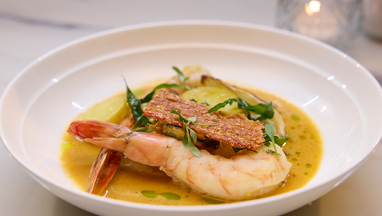 Laura - Prawn-Filled Scarpinocc Pasta, Prawn Bisque, Basil Oil, Onion Soubise & Fried Onions.
