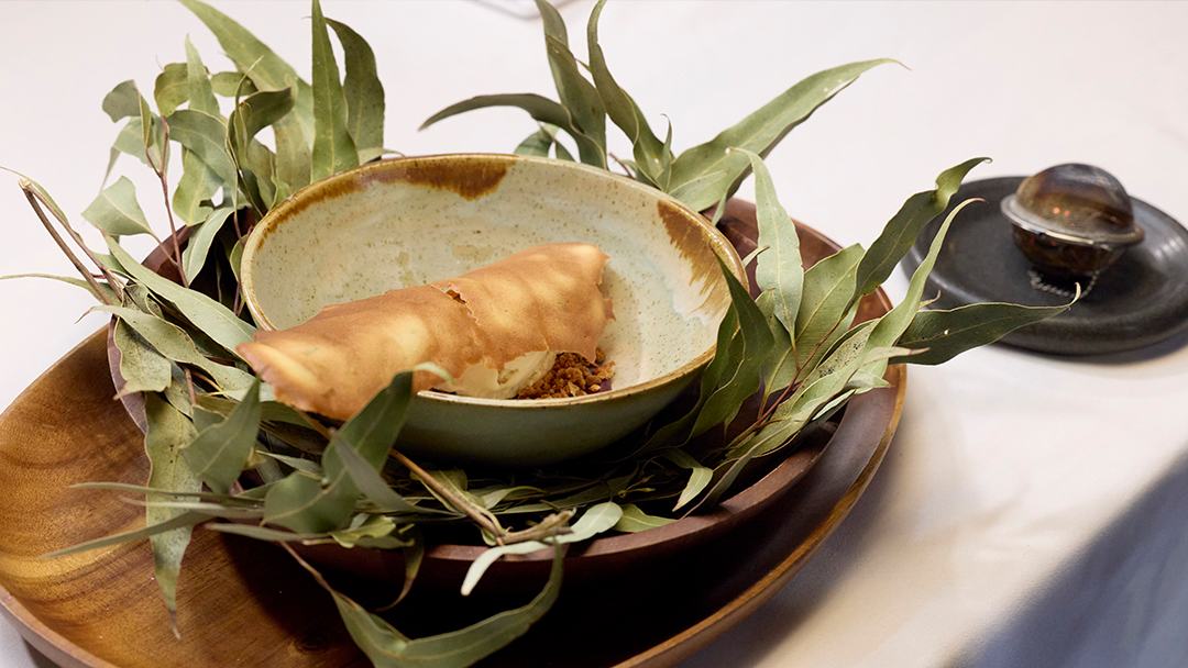 Beau made an Anzac biscuit themed dish with Black Tea Ice Cream, Anzac biscuit crumb, plum jam and rosemary bark with burned gum leaves as an aromatic garnish. The burning leaves were his flair element. The judges loved this dish also.