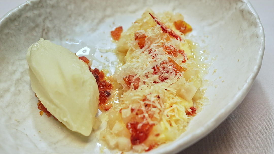 The last impressive dish was made by Jamie who made a dish with comte (cheese custard), pear sorbet, roasted macadamia praline and both poached and fresh pears. He then added the flair of calvados (apple & pear liqueur) infused clouds of bubbles which delighted the judges.