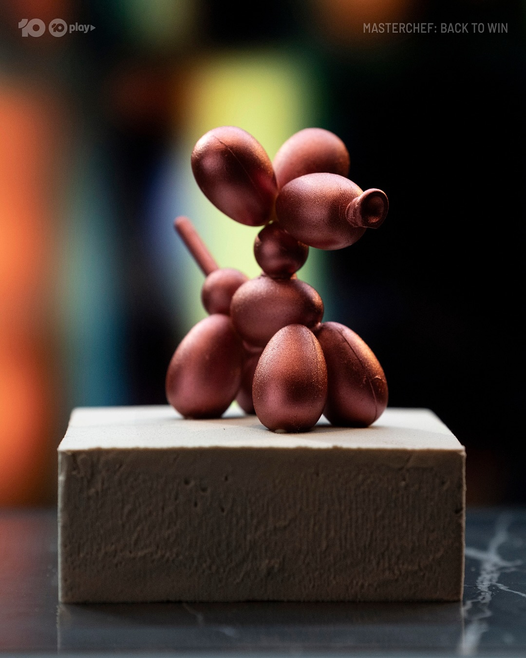 Tonight on MasterChef, guest chef Stephen He brought in one of the most unusual desserts I have ever seen, a balloon dog sitting on a slab of concrete. At least that is what it looked like on the surface.