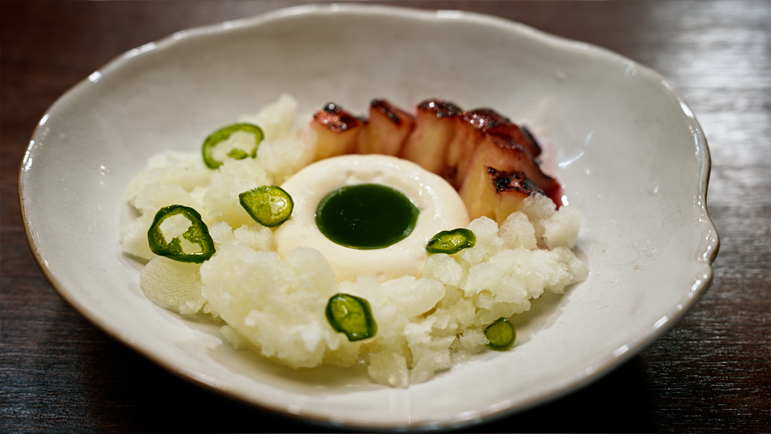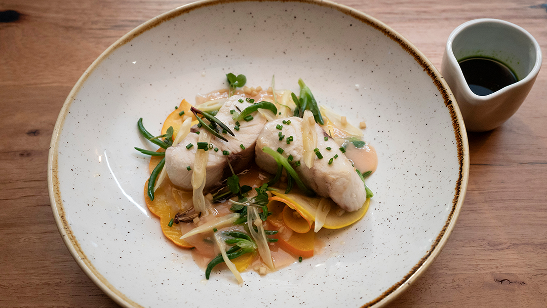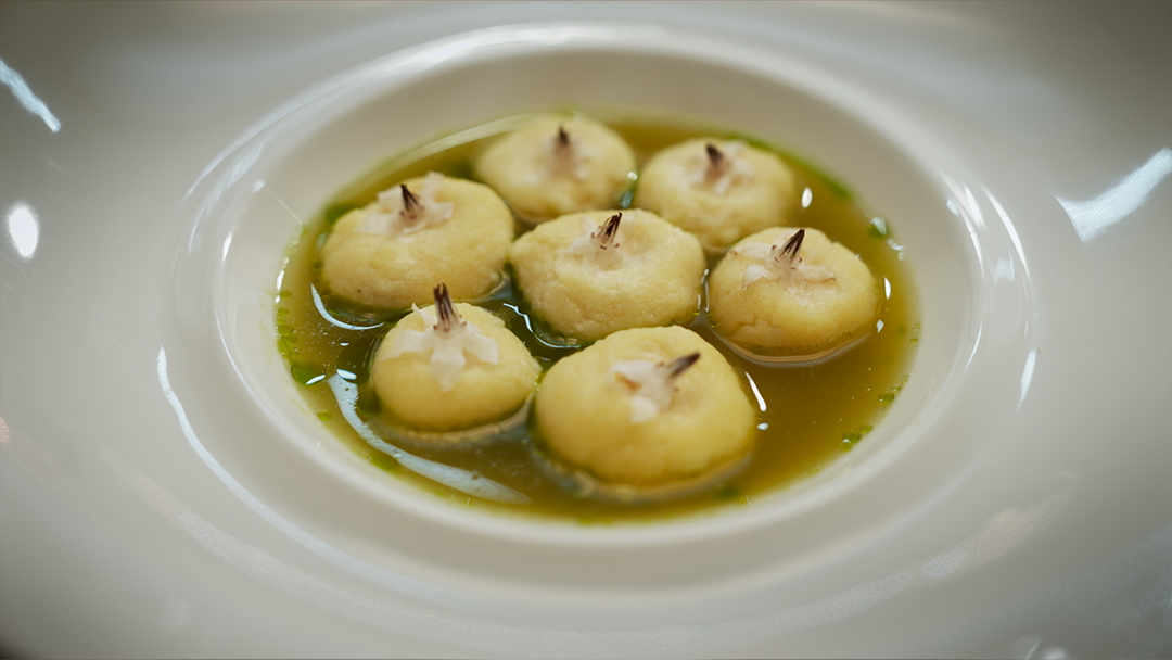 Andre made Buttermilk Ricotta Gnocchi, Charred Cucumber Consomme & Borage Oil.