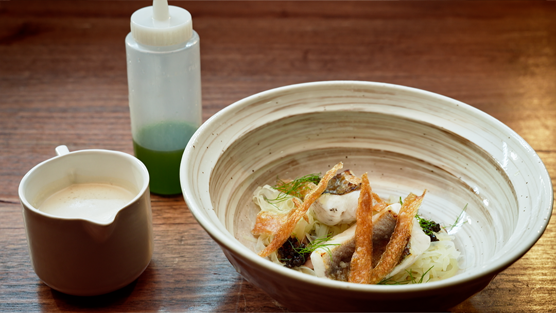 Now we have TEAM PURPLE. From the very beginning they had a clear idea of what dish they were trying to create, they had excellent communication between themselves and they showed what a team really was supposed to be. There was only one error, which could have been critical, but it was rescued by keen intuition and talent. Callum had a vision for a dish consisting of fish, potato noodles and crispy potato skins, charred potato skin broth, pickled pipis, bay oil, caviar and fennel fronds. Laura picked up on this and continued on this path, and for a while did well, but she had some problems with the noodles which she overcooked and they were slightly mushy. Depinder stepped in and completely remade the noodles but she made sure they were neither overcooked nor undercooked, thus saving the dish from another possible catastrophe. Andre took over and made the dish into a feast for the eye and palate.